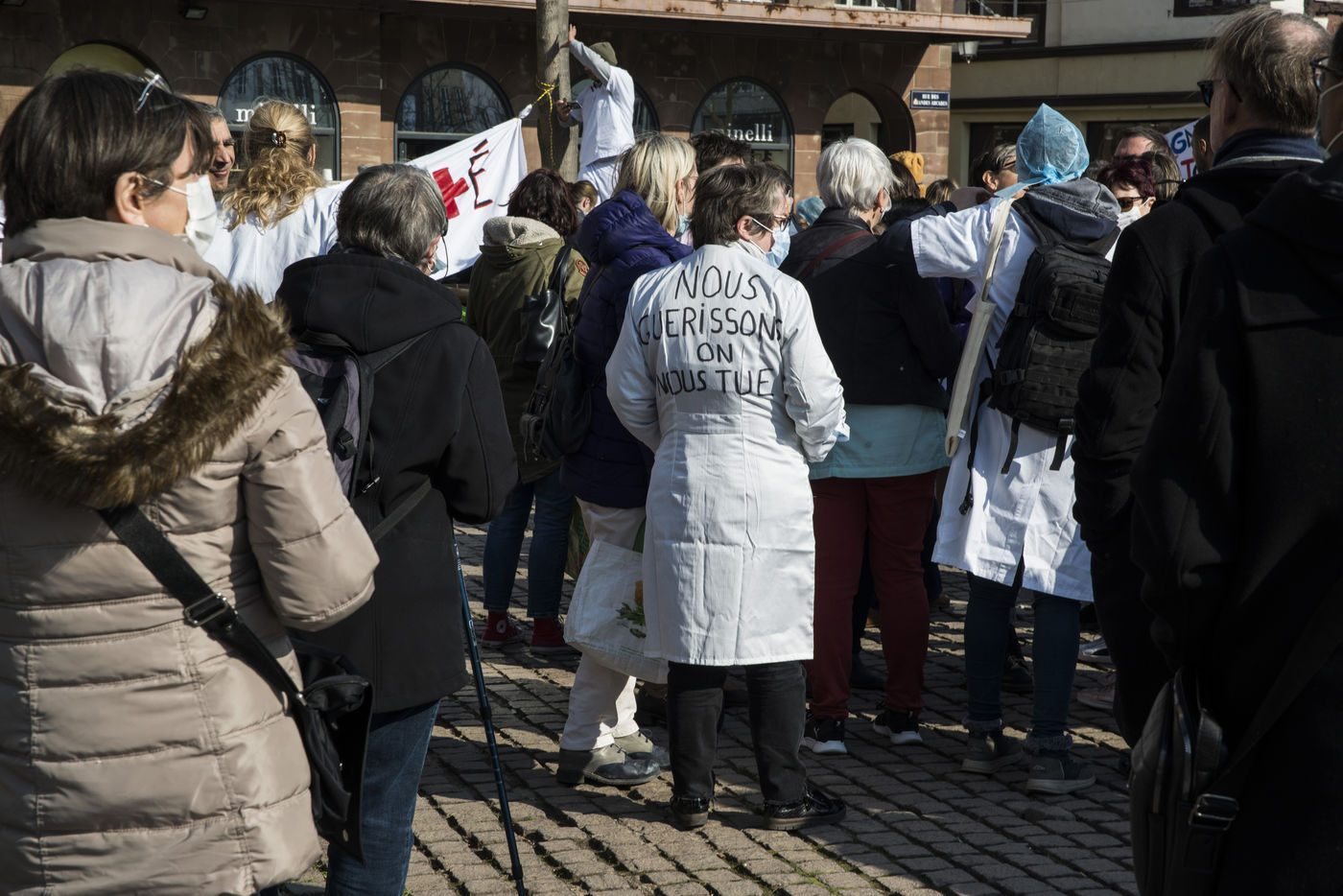 Des soignants manifestent contre la déterioriation de l'hôpital public et pour sa survie à Strasbourg.