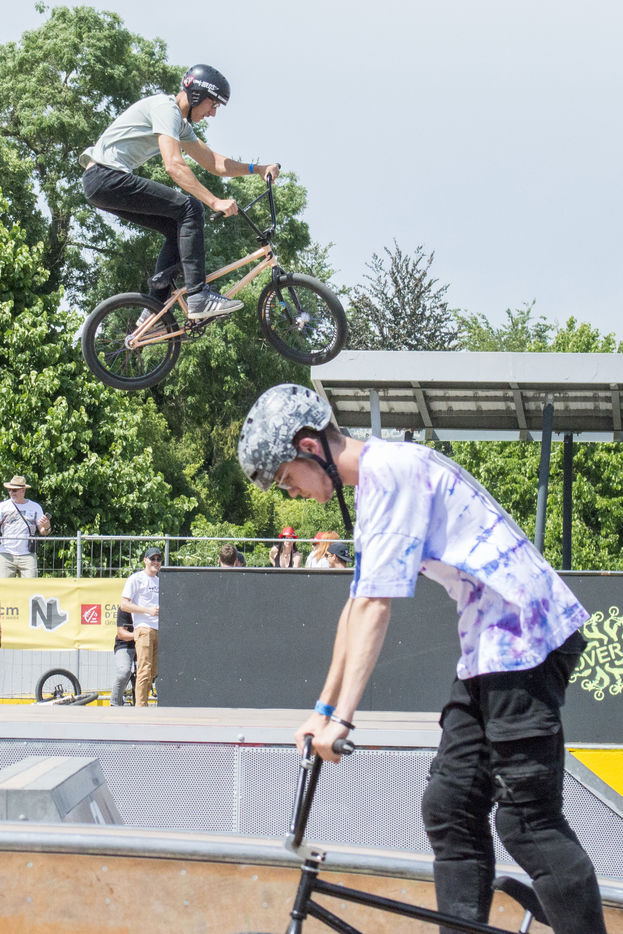 Des centaines de personnes assistent au premier jour du NL Contest (Nouvelle Ligne), un festival de cultures urbaines et une competition de sports urbains a Strasbourg au skatepark de la Rotonde.