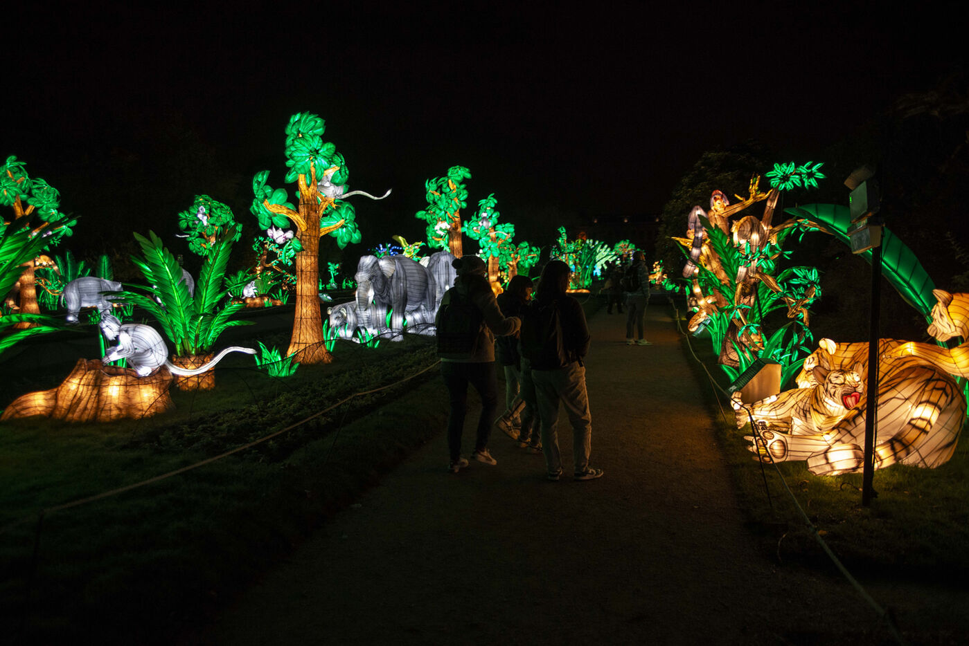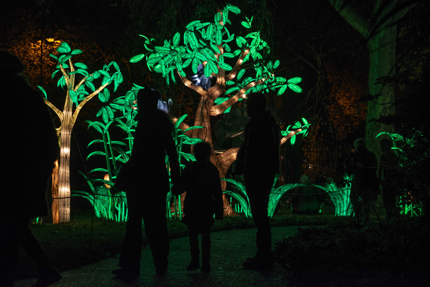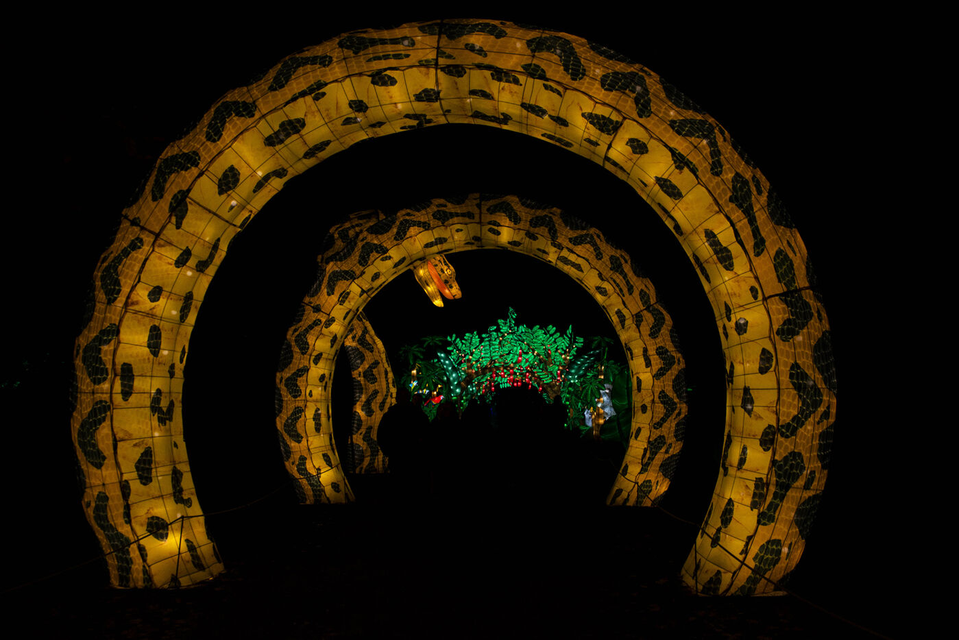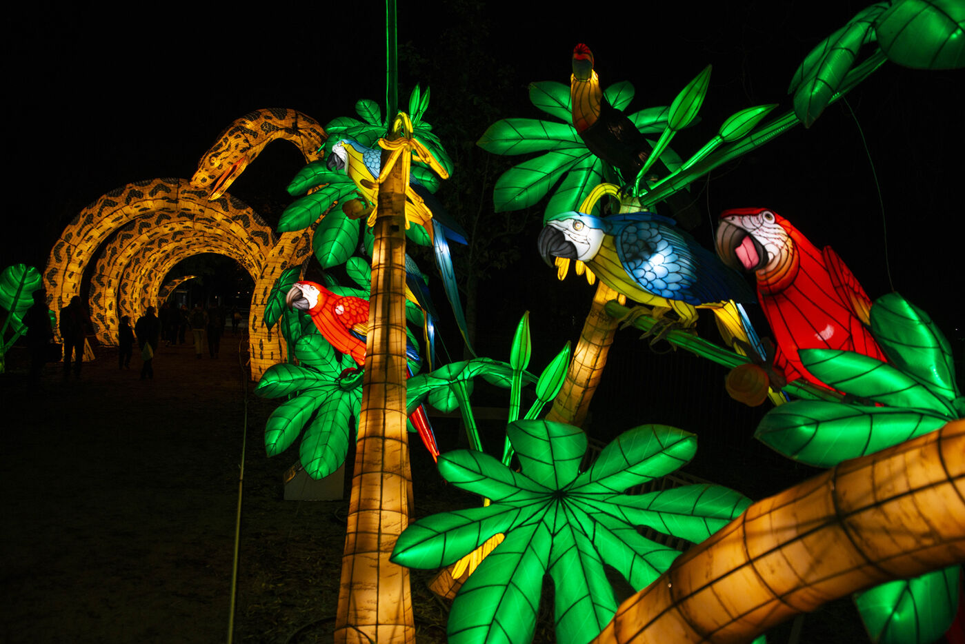 These photographs show a view of the Jungle En Voie d Illumination light exhibition by the Museum of Natural History at the Jardin des Plantes, depicting the biodiversity fauna and flora of tropical humid forests in Paris.