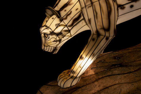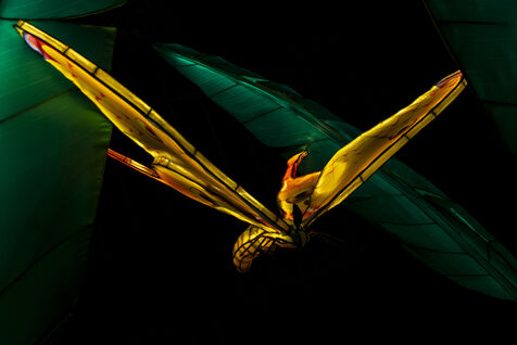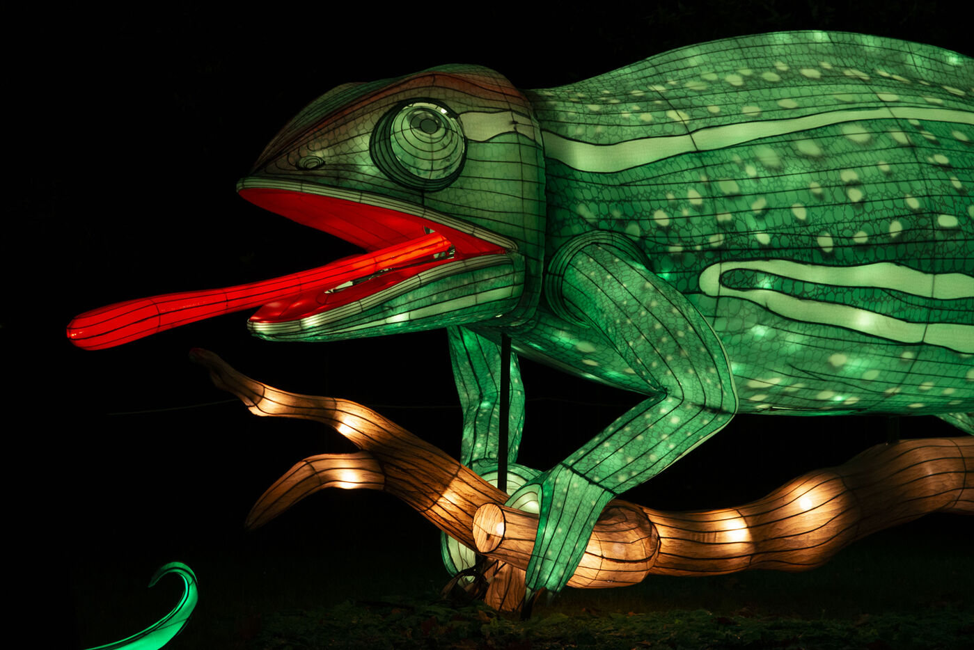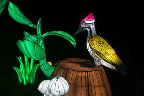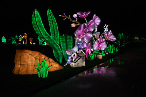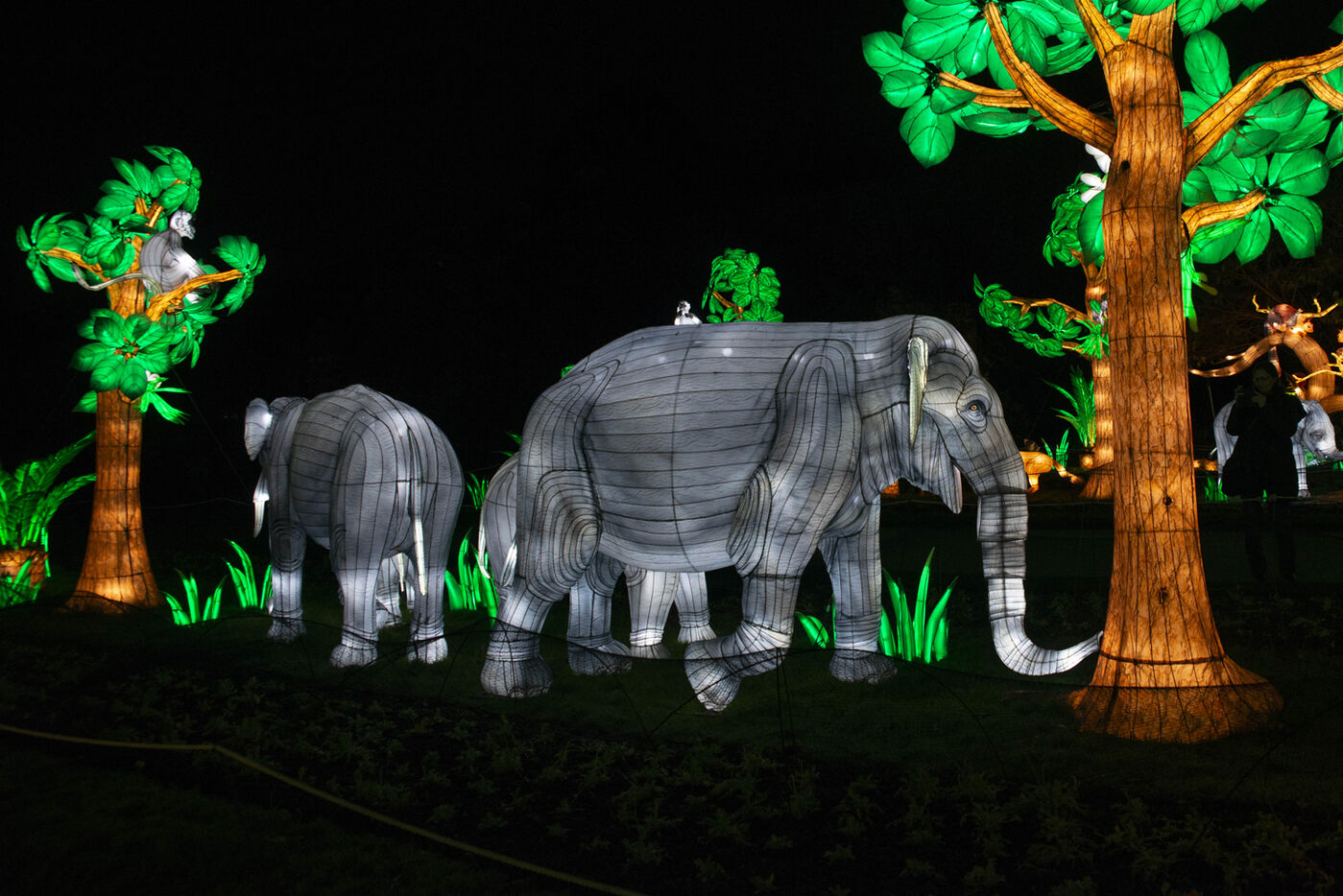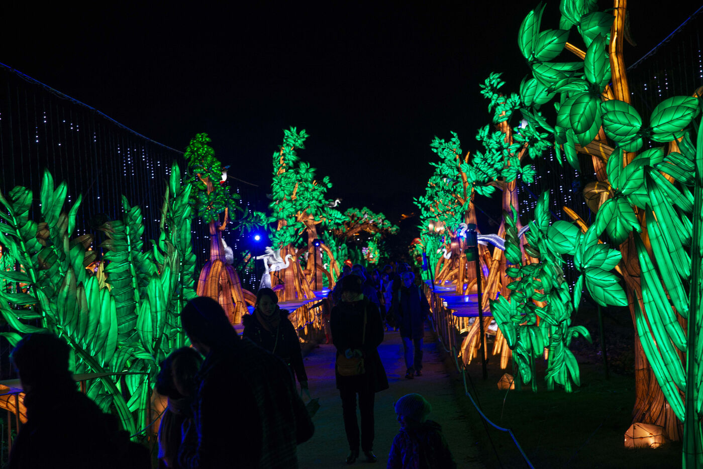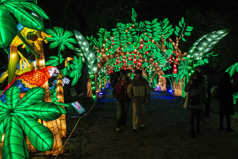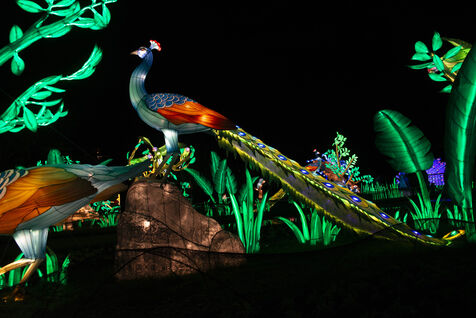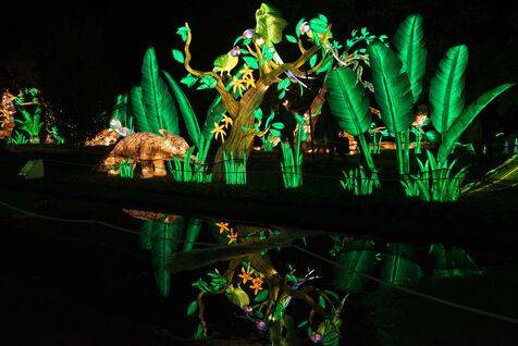 These photographs show a view of the Jungle En Voie d Illumination light exhibition by the Museum of Natural History at the Jardin des Plantes, depicting the biodiversity fauna and flora of tropical humid forests in Paris.