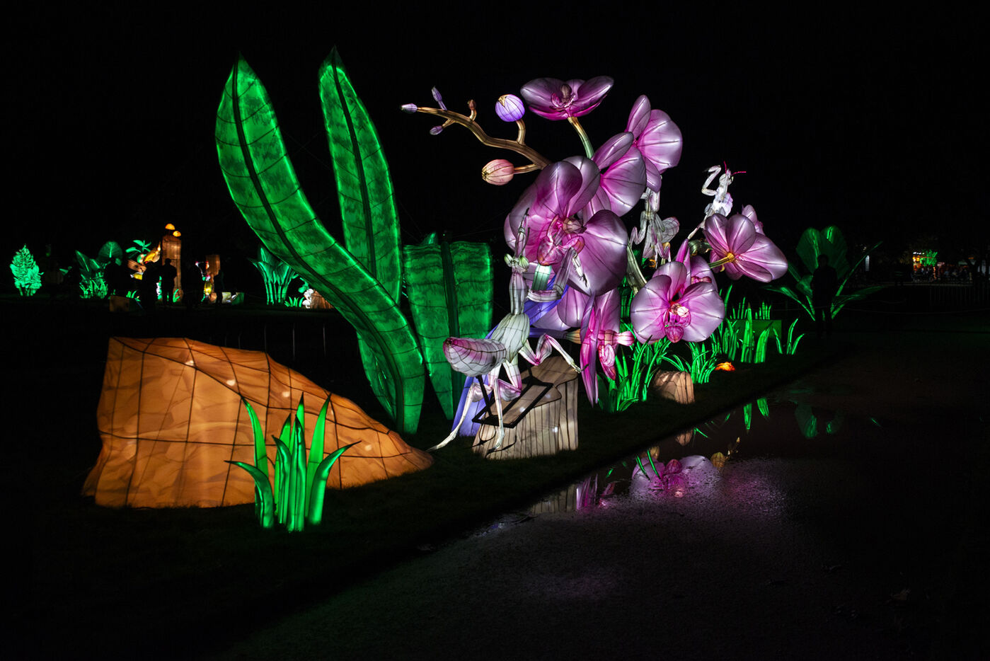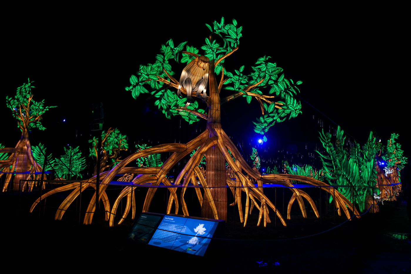 Ces photographies montrent une vue de l exposition de lumiere Jungle En Voie d Illumination par le Museum d Histoire Naturelle au Jardin des Plantes a Paris, representant la biodivesite faune et flore des forets tropicales humides.