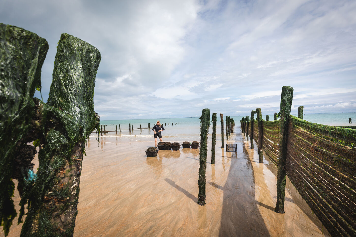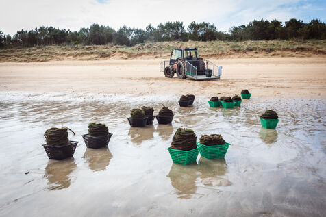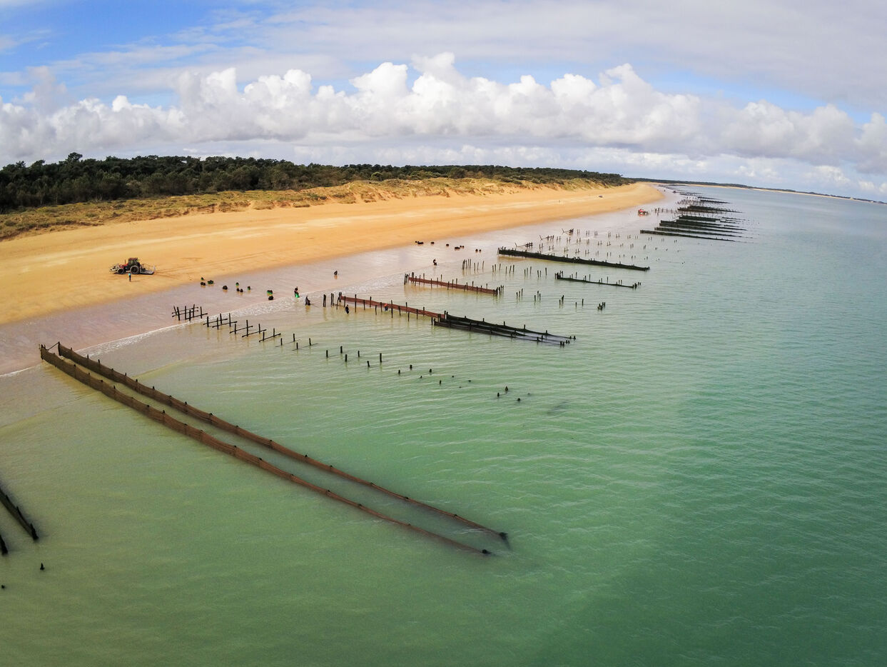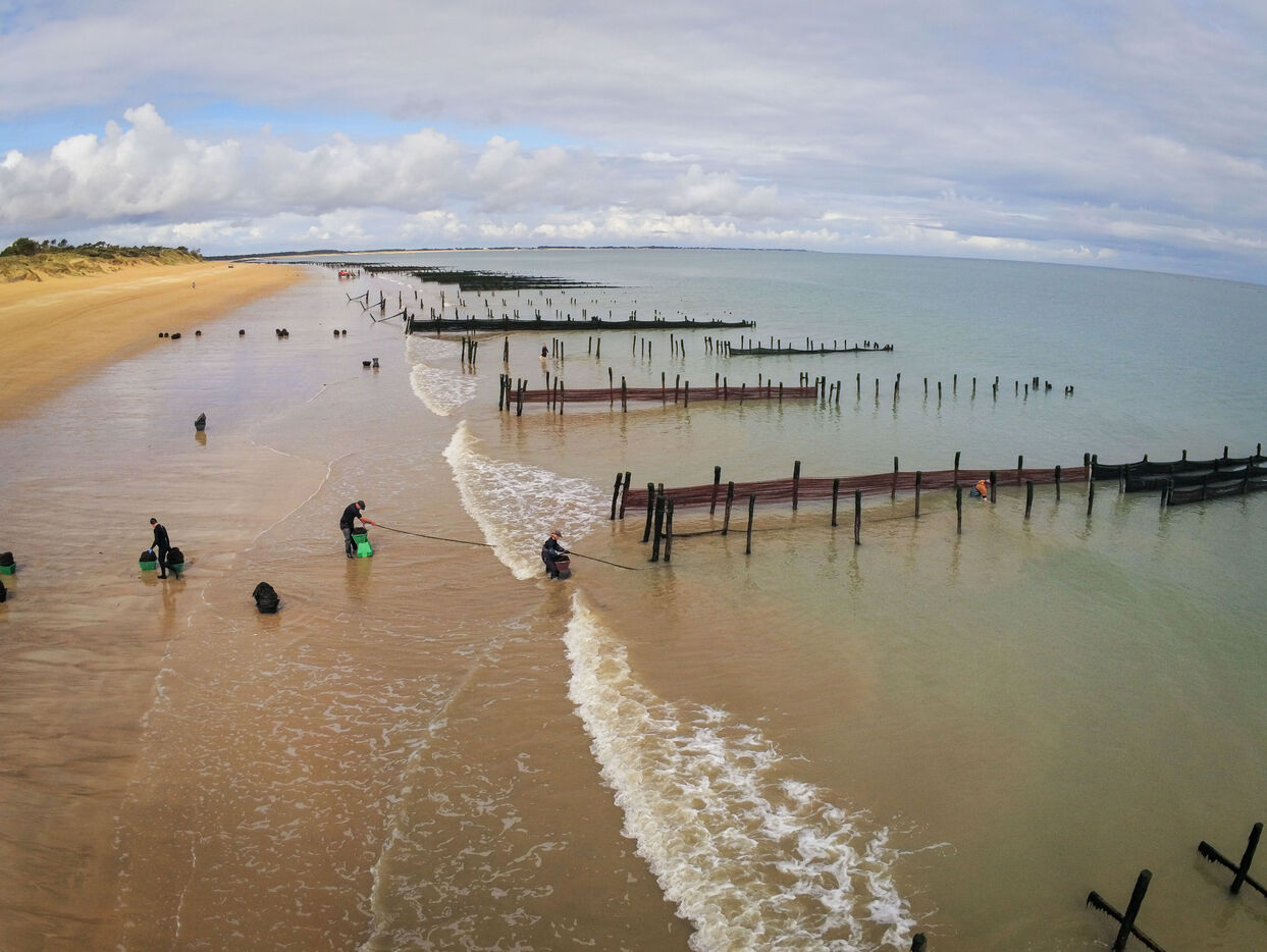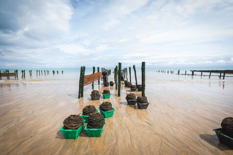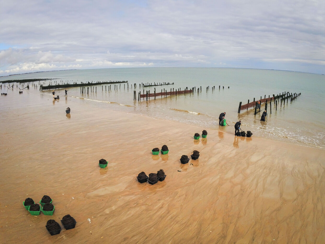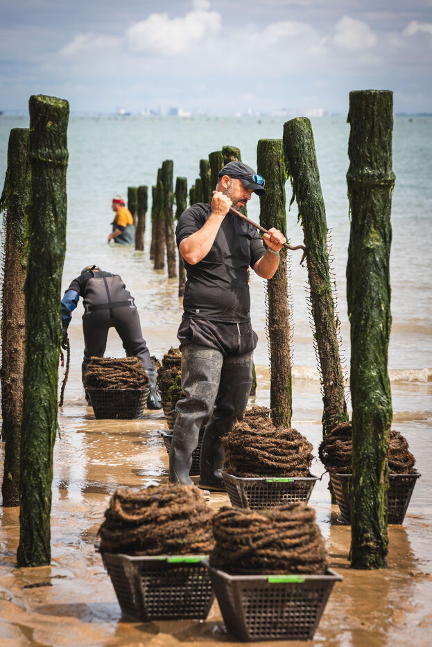 It's on the Saumonards beach, on the outskirts of the famous Fort Boyard, that the work of raising mussels begins. The first step is the collection stage: long coconut fiber ropes are installed on wooden stakes along the beach for several months (between February and May). This ancestral technique enables the mussel larvae (spat) to attach themselves to the ropes and develop. By May, the spat are large enough to move the ropes.The ropes are then unhooked, wound into mantles (each mantle contains 100m of rope filled with spat) and sold to breeders who will allow the mussels to grow to adult size.