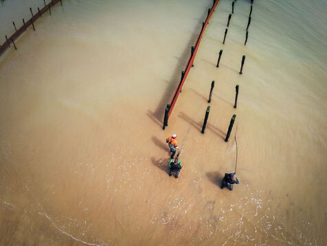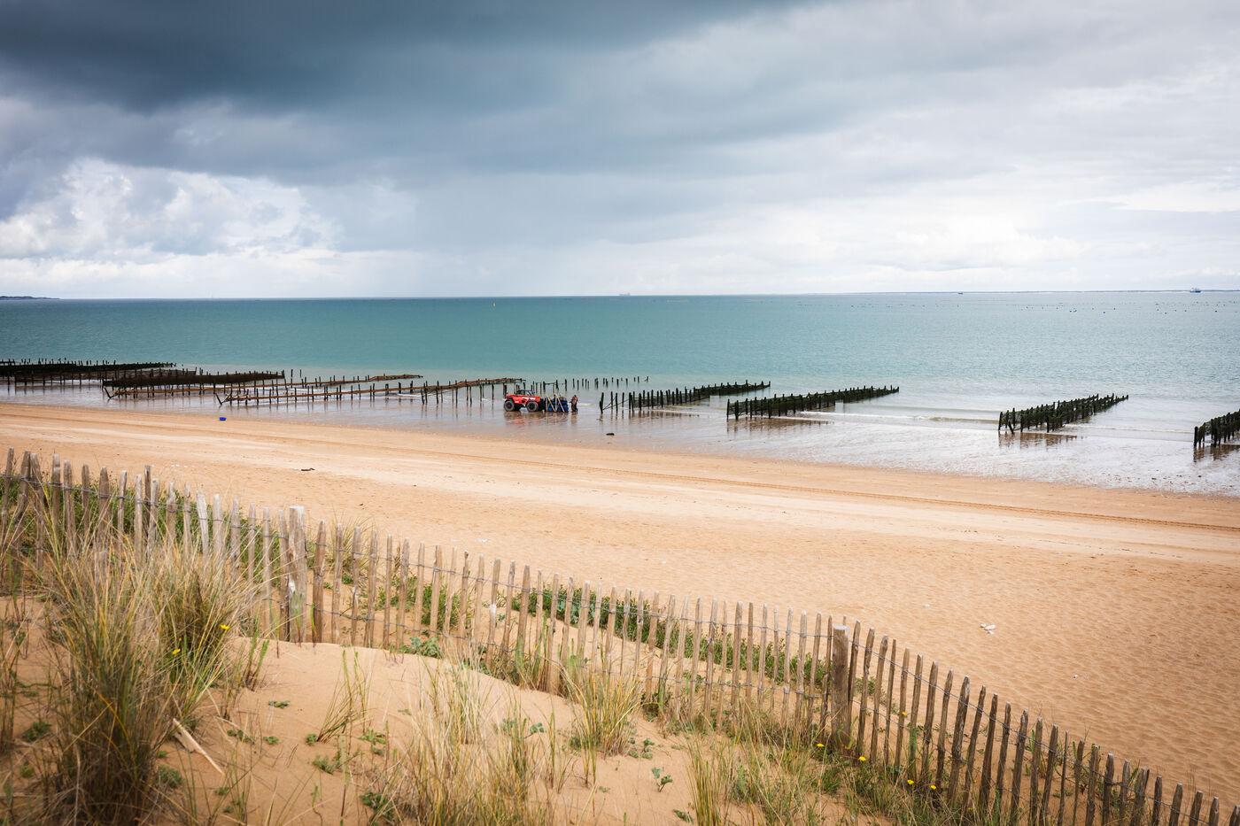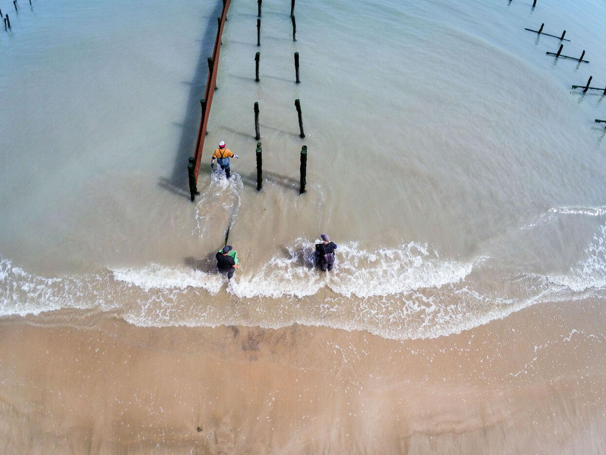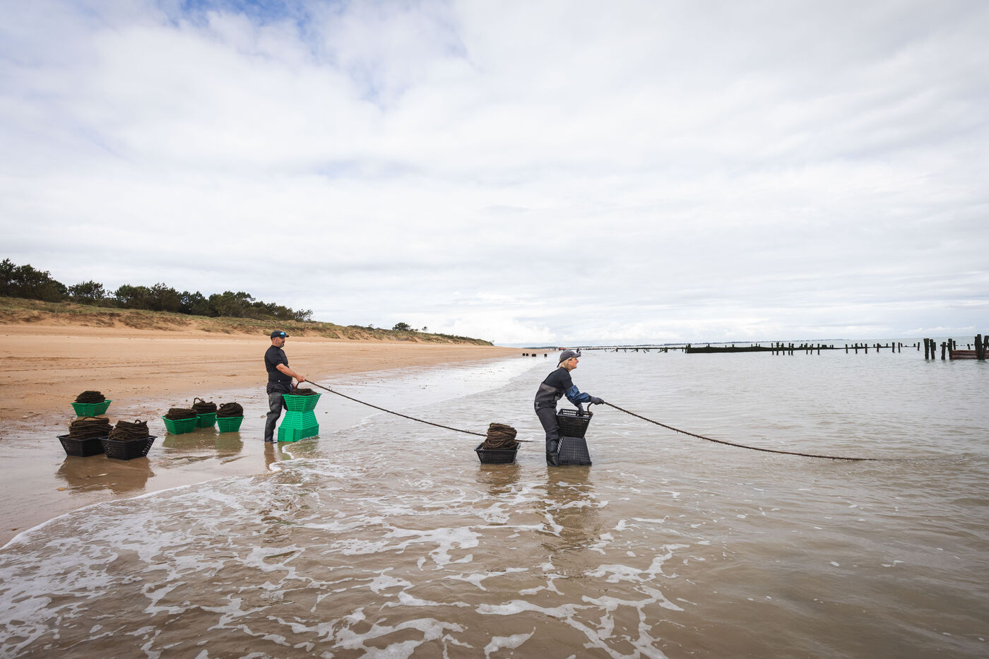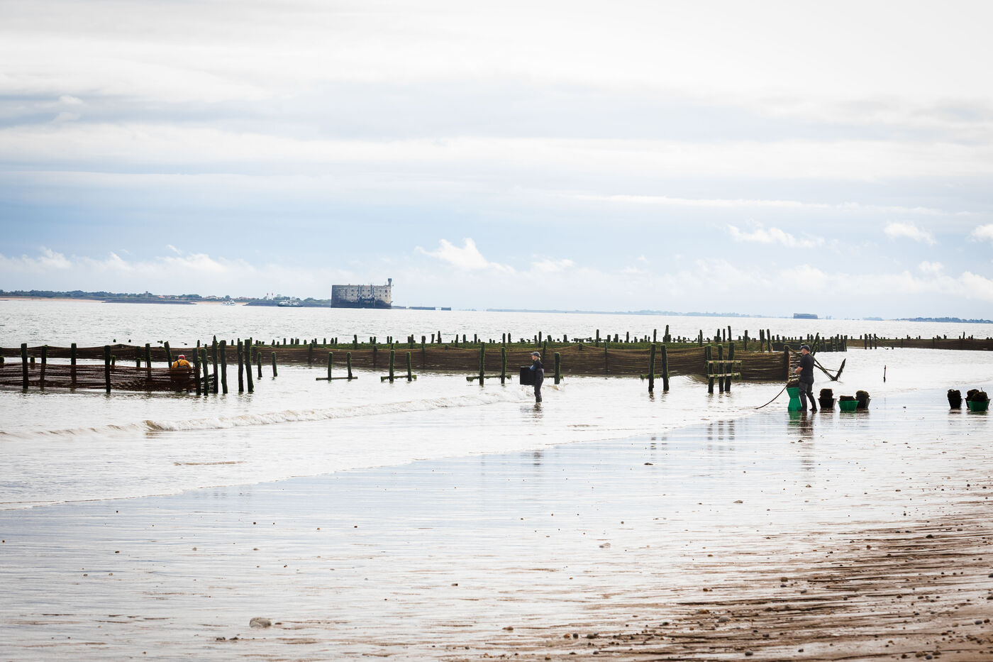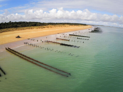 It's on the Saumonards beach, on the outskirts of the famous Fort Boyard, that the work of raising mussels begins. The first step is the collection stage: long coconut fiber ropes are installed on wooden stakes along the beach for several months (between February and May). This ancestral technique enables the mussel larvae (spat) to attach themselves to the ropes and develop. By May, the spat are large enough to move the ropes.The ropes are then unhooked, wound into mantles (each mantle contains 100m of rope filled with spat) and sold to breeders who will allow the mussels to grow to adult size.