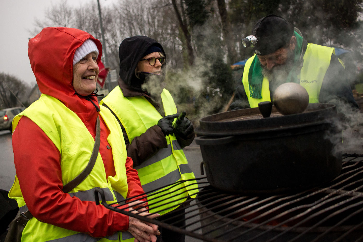 Des gens en jaune et du brouillard (Dinan, Bretagne)