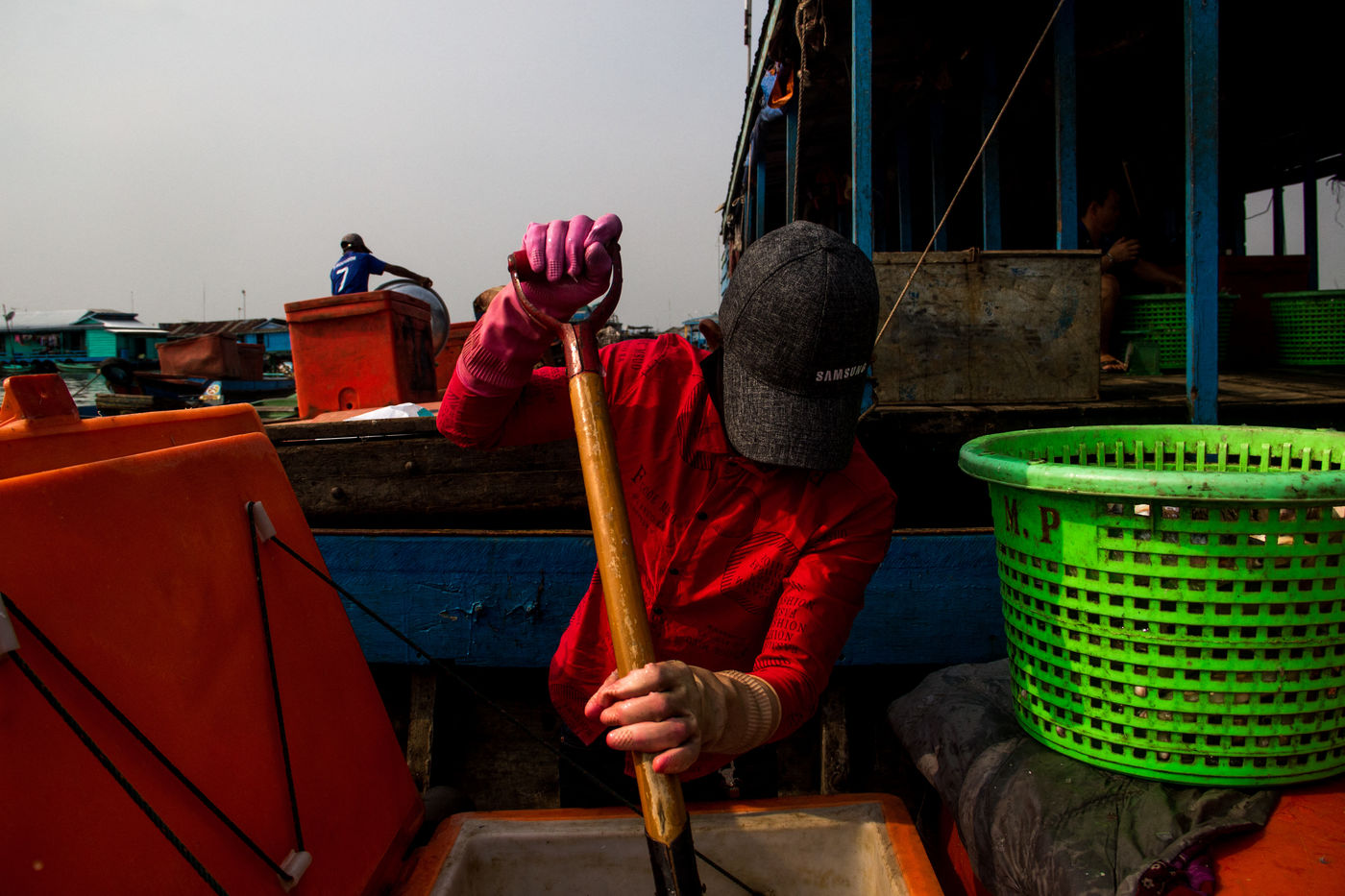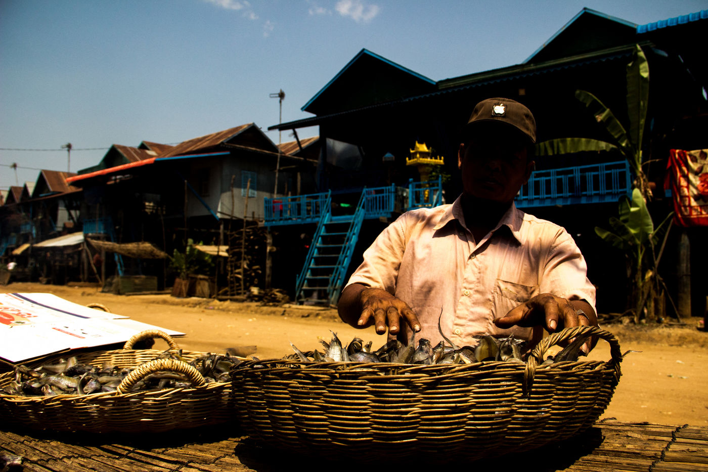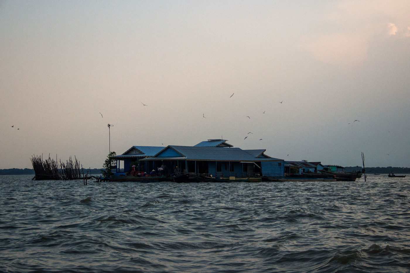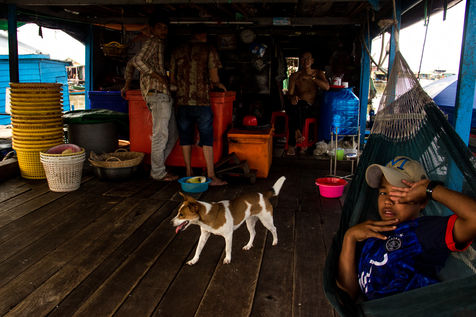 Mais ce n'est pas tout, ici les hommes vivent également sur l'eau. On compte sur le lac 170 villages flottants qui abriteraient 90 000 habitants. Dans ces cités aquatiques qui se déplacent au rythme des crues, on retrouve presque les mêmes infrastructures que sur les villes terrestres. Ecoles, habitations, lieux de culte, magasins d'électronique, karaokés, stations essence ; tout flotte et les habitants circulent en bateau d'un lieu à l'autre.