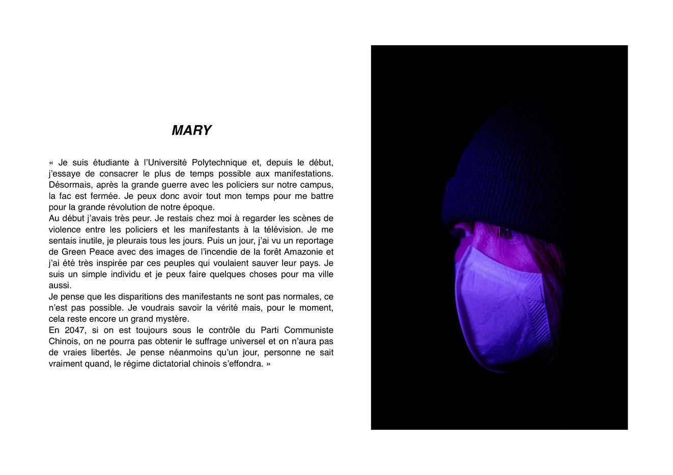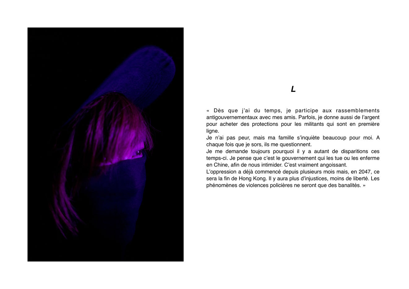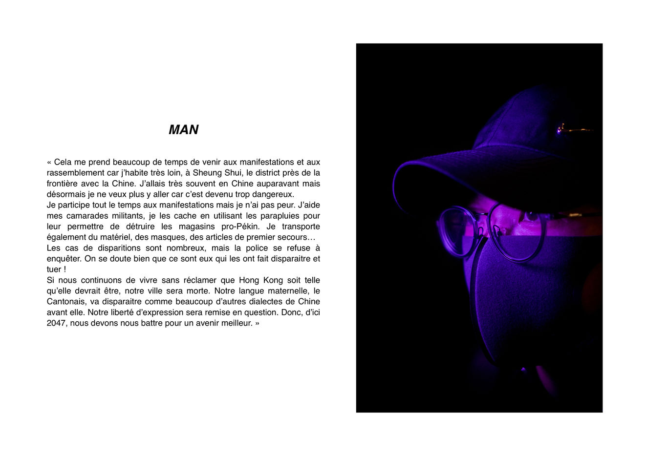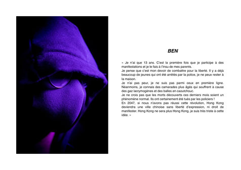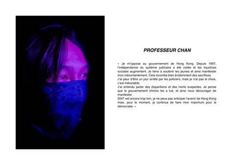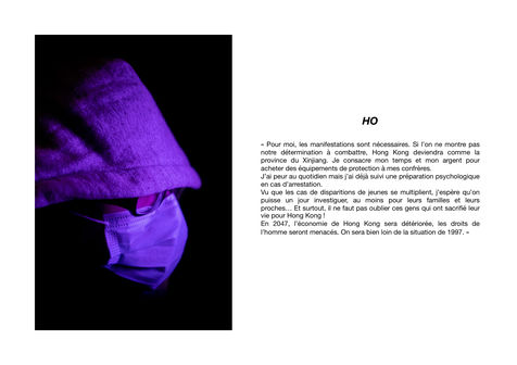 Thus, this documentary project mixing photographic portraits and interviews aims to give a voice to Hong Kong activists on these issues while allowing them to present themselves under a pseudonym and hide their identity, once again representing the fear they feel.