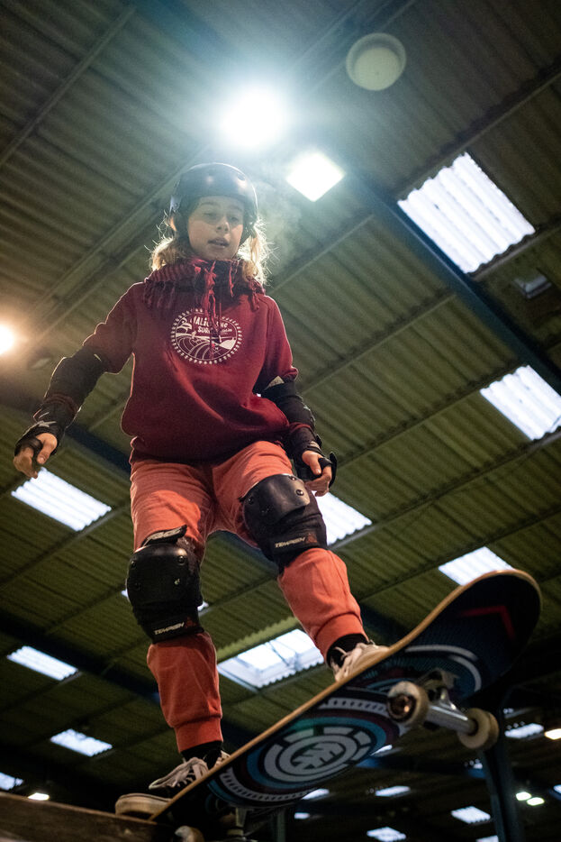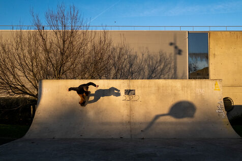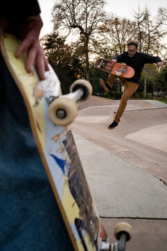 Christophe, also a pioneer member of the association, is known and recognized in the agglomeration for teaching skateboarding to beginners. His public is very large: individuals, schools and even prisoners from the Saint-Brieuc prison. That day, two of his pupils were present at the hall. With benevolence, he helps them to apprehend their first tricks despite the legitimate fear of launching themselves for the first time on a ramp. ?Christophe regularly visits different sites in the area to skate: the pumptrack in Langueux, "great for those who like speed"; the spot in front of the IUT, "more urban for those who want to do street"; and the skateparks in Balzac and Parc des Promenades. The association has fought hard for the construction of its municipal facilities and in particular the latest skatepark. "Before 2014, there was practically nothing in Saint-Brieuc, which is not worthy of a city like this. The Balzac skatepark was a first positive point," recalls Nicolas. In 2019, the big skatepark of the Promenades arrived like a godsend for the local riders. "It's good because it was built by real skatepark builders and not by some construction companies responding to public tenders as is often the case in other cities," insists Christophe.