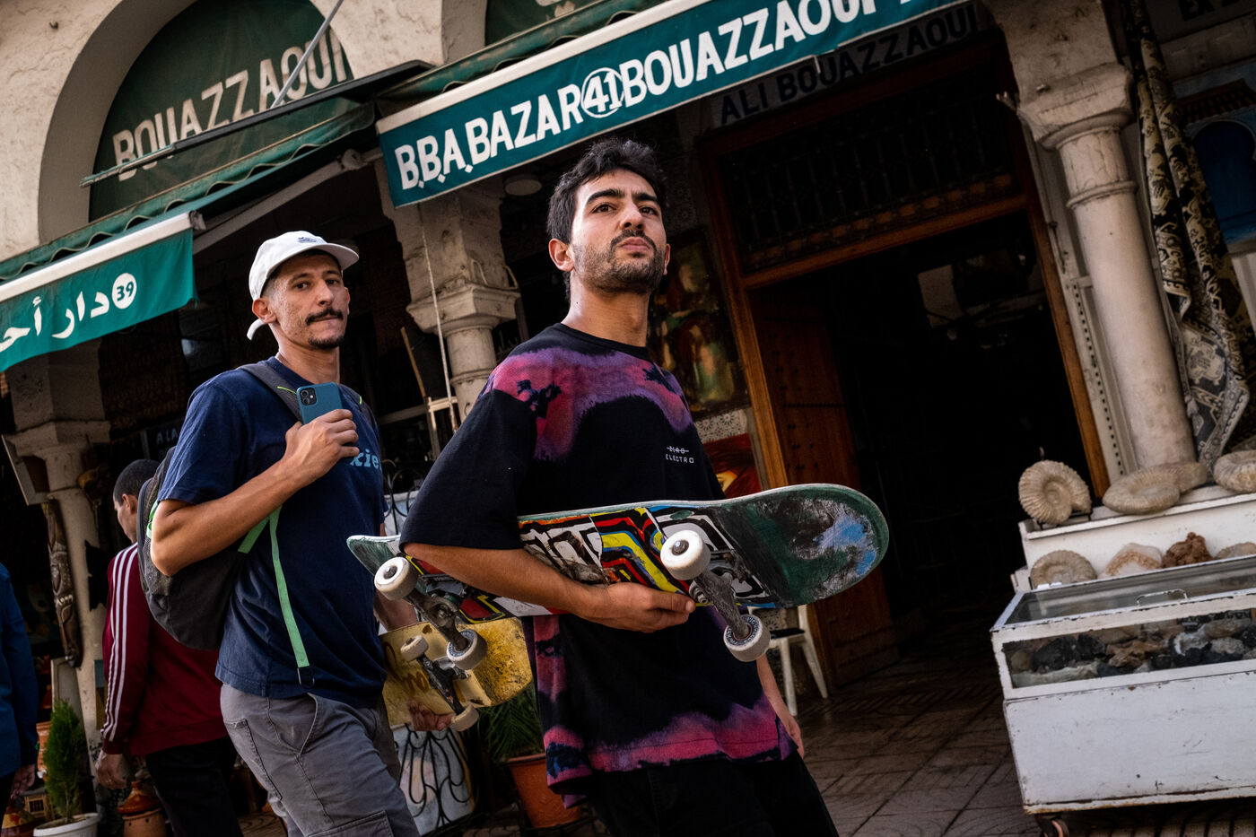 For some years now, the spectacular development of Morocco's economic capital has been correlated with the construction of infrastructures that encourage the practice of these urban sports. As Akram reminds us, "before the Nevada skatepark was built in 2018, which enabled us to make a lot of progress, there was nothing. We skated on spots we found in the street. There was only the Ain Diab skatepark, but it was broken up and cost 20 dirhams to get in. For Yassine, who is now a skateboarder sponsored by Bears Skateshop, a shop based in Rennes in France, the story goes back fifteen years: "I grew up in Oujda in north-east Morocco. When I was 9, I spotted a boy skateboarding in the street. I was fascinated. My parents bought me my first board and this boy quickly became my friend. My father would go with me to find places to practice and then sit in the café while I had fun. Little by little, I met Mouad, who makes our videos, and other skaters. At the time, it was still really hard to skate in Oujda because of the mentality of the people, who thought we were satanists. At the time, when I went on family holidays to Casablanca, I found the first groups of skaters who roamed the city and built small ephemeral skateparks with their own resources extraordinary. It's to this older generation that we owe the growth of skateboarding in Morocco and these new infrastructures".