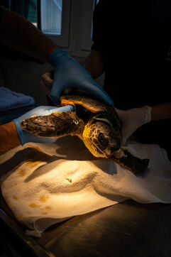 Lea, a tiny 3-year-old loggerhead sea turtle, was found on the coast near the centre by French-Canadian volunteer Alex, who dived in to rescue her. She had serious injuries to her neck and flipper caused by entanglement in a fishing net. "What's more, after carrying out an X-ray, we realised that she had also ingested a fishing hook," explains Alex. Eirini details her treatment: "injections of antibiotics, vitamins and cleaning of the wounds. Unfortunately, her flipper is badly damaged and she will have to be amputated, but before that we have to remove the hook from her stomach once she has regained her strength. In the meantime, she is on a fluid drip as she is not feeding. We don't know how long she'll need to recover, probably 4 or 5 months. We're not sure she'll pull through."