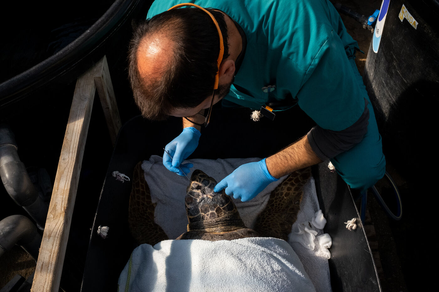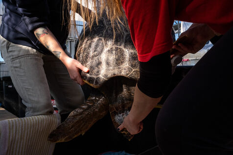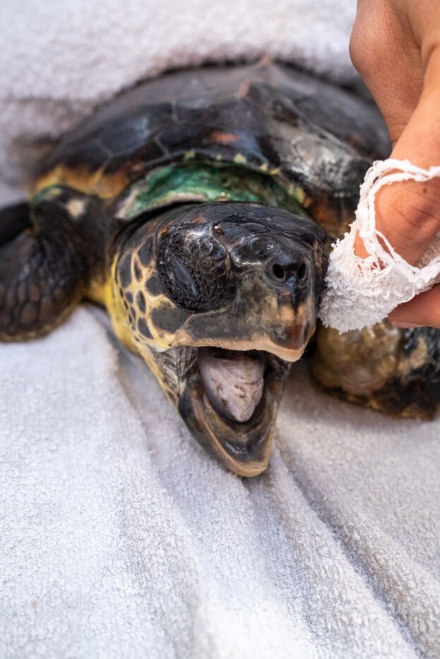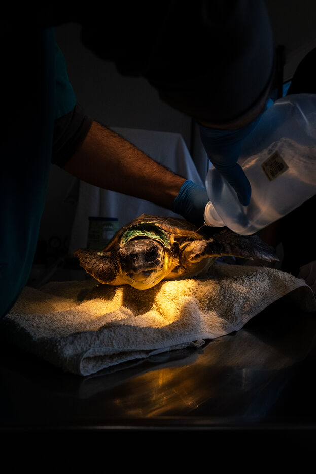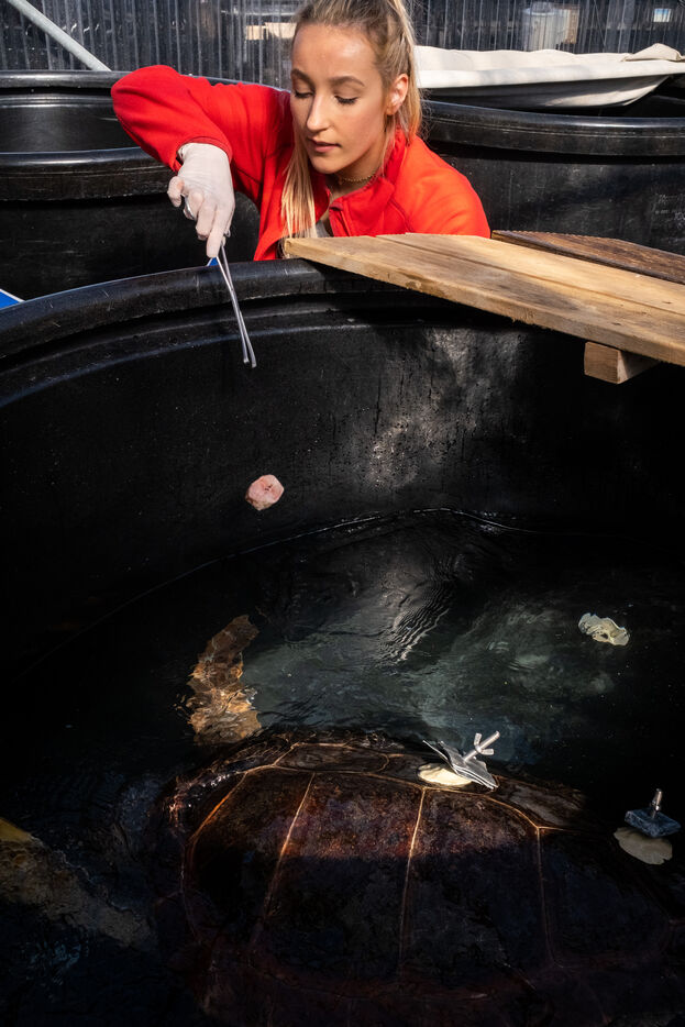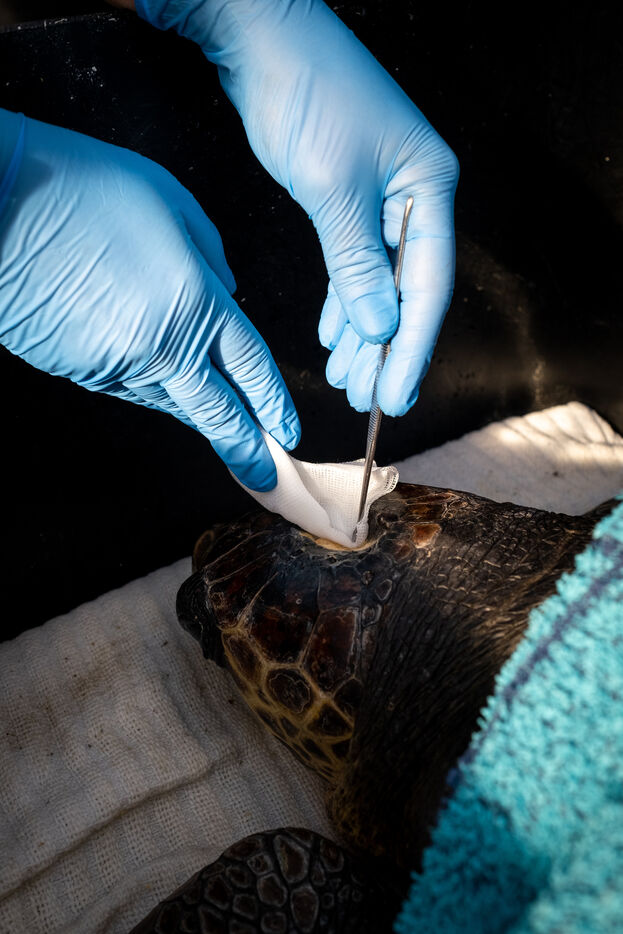 Les vétérinaires veillent aussi de près sur les tortues. Ils passent effectuer des relevés ou encore installer une perfusion. Parfois, ils emmènent une tortue dans le bloc opératoire pour des interventions plus complexe. Les tortues doivent parfois être amputés d'une ou plusieurs nageoires. « Malgré cela, elles peuvent souvent retourner dans la nature, ce sont des animaux puissants. » nous dit la biologiste. Des poids sont souvent fixés sur les carapaces des tortues. Les blessures à la tête causant des troubles neurologiques, l'installation de plaques de métal lestées leur aident à retrouver l'équilibre et à nager de nouveau.