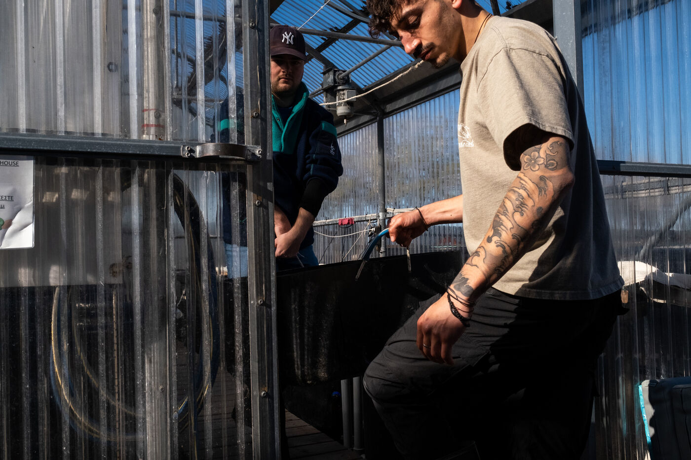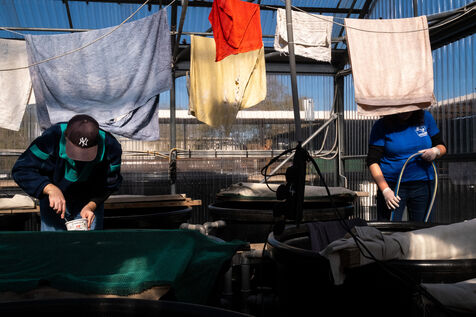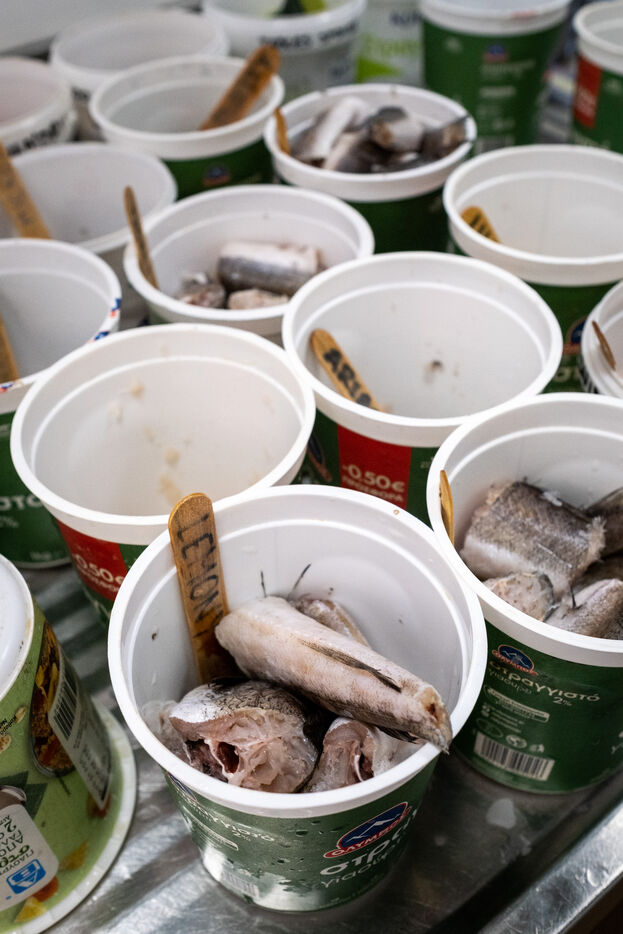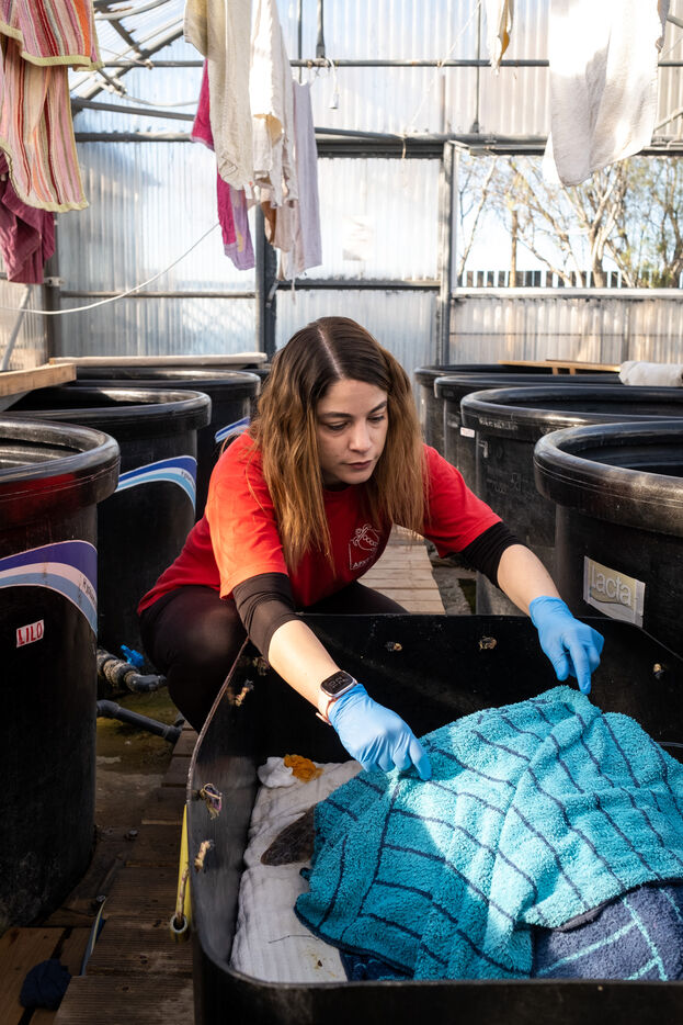 At the entrance to the centre is a rack of around fifty jars labelled with a name and year containing the various objects, mainly hooks and fishing line, found in the turtles' oesophagus. "With the vets, we are forced to remove them by operation or with a powerful laxative", explains Eirini. The centre is made up of two large greenhouses where it is very hot. This is where the most vulnerable turtles are cared for. Throughout the day, the animals are pampered. Volunteers clean them, disinfect their wounds and change the bandages on their damaged flippers. The water in the tanks is changed regularly and the temperature is carefully monitored. Each turtle has a special diet depending on its state of health: fresh fish, squid or even prawns. "In the wild, turtles only eat shellfish, never fish, contrary to what fishermen think" points out Eirini.