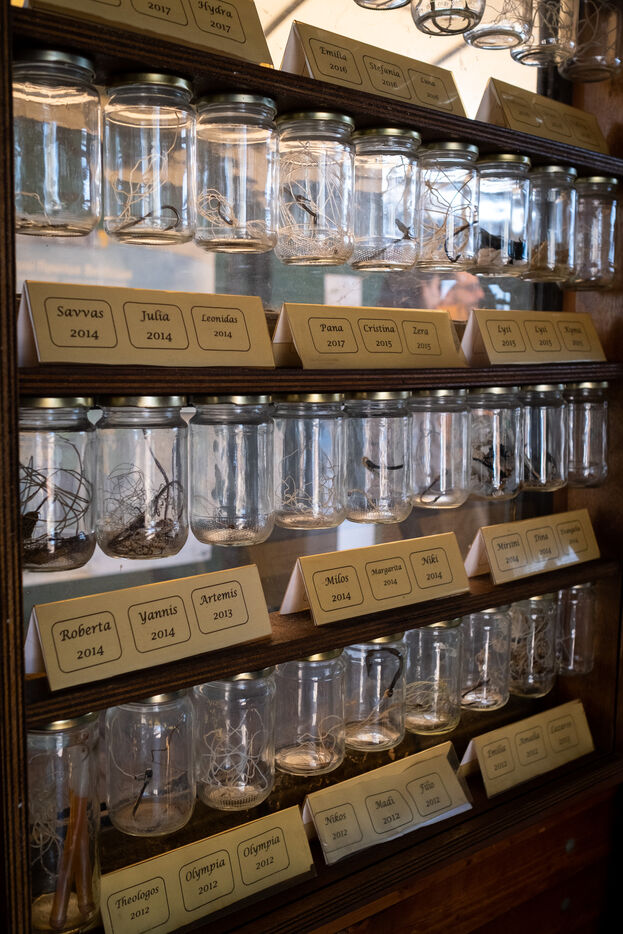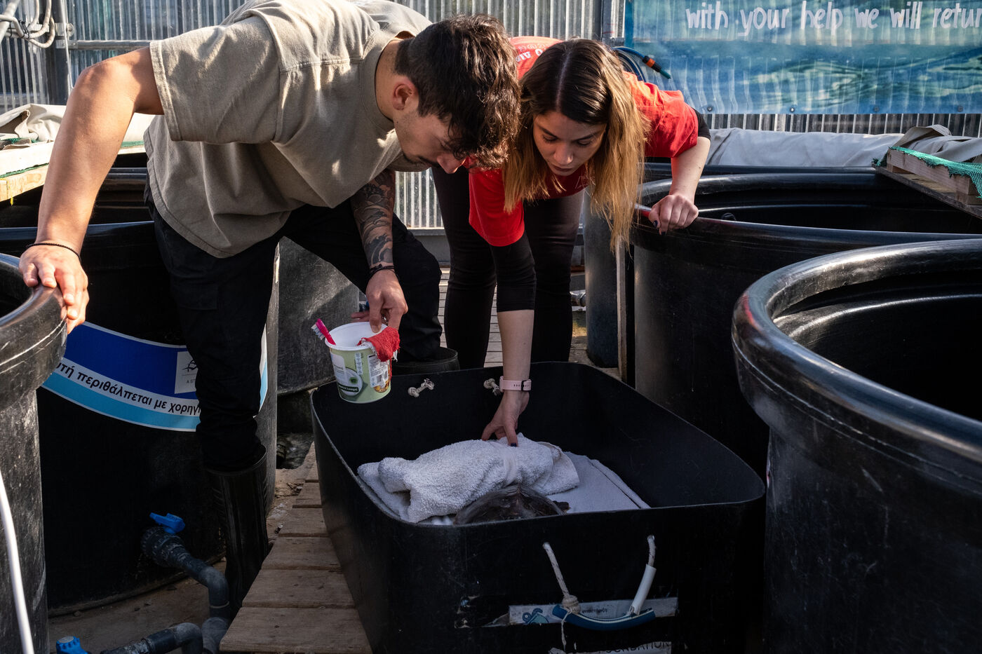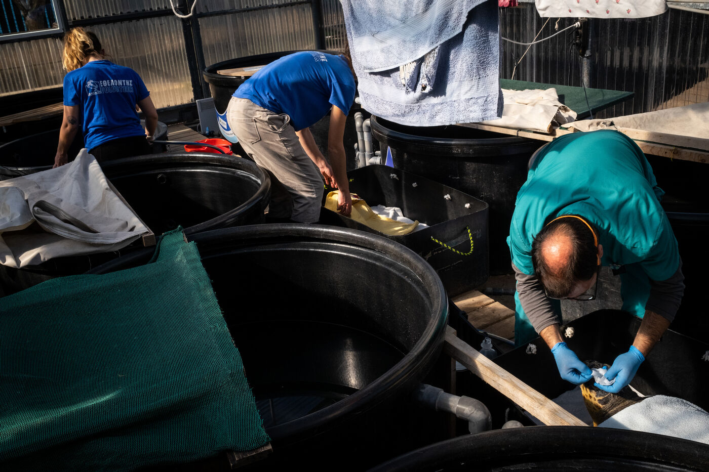 À l'entrée du centre se trouve une étagère d'une cinquantaine de bocaux accompagnés d'une étiquette avec un nom et une année contenant les divers objets, principalement des hameçons et des lignes de pêche, retrouvés dans les ?sophages des tortues. « Avec les vétérinaires, on est forcé de les retirer par opération ou bien avec un laxatif puissant », détaille Eirini. Le centre est composé de deux grandes serres dans lesquelles il fait très chaud. C'est là que sont accueillies les tortues les plus vulnérables. Tout au long de la journée, les animaux sont cajolés. Les volontaires, les nettoient, désinfectent leurs blessures et changent les bandages sur les nageoires abîmées. L'eau des bassins est régulièrement renouvelée et la température est minutieusement contrôlée. Chaque tortue a un régime spécial en fonction de son état de santé : poisson frais, calamars, ou encore crevettes. « Dans la nature, les tortues se nourrissent uniquement de crustacés, jamais de poisson, contrairement à ce que pensent les pêcheurs » rappelle Eirini.