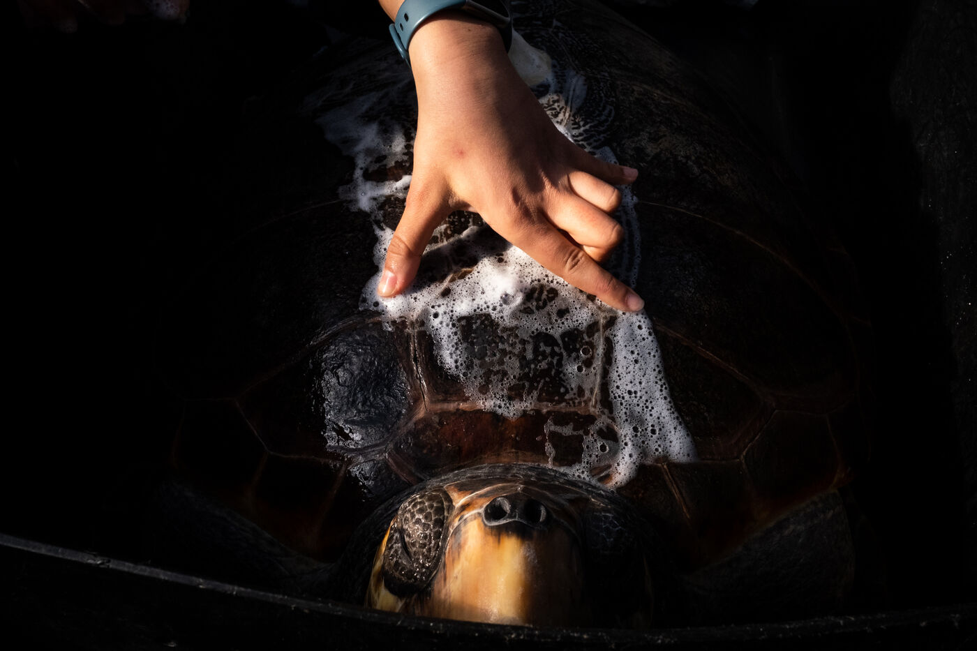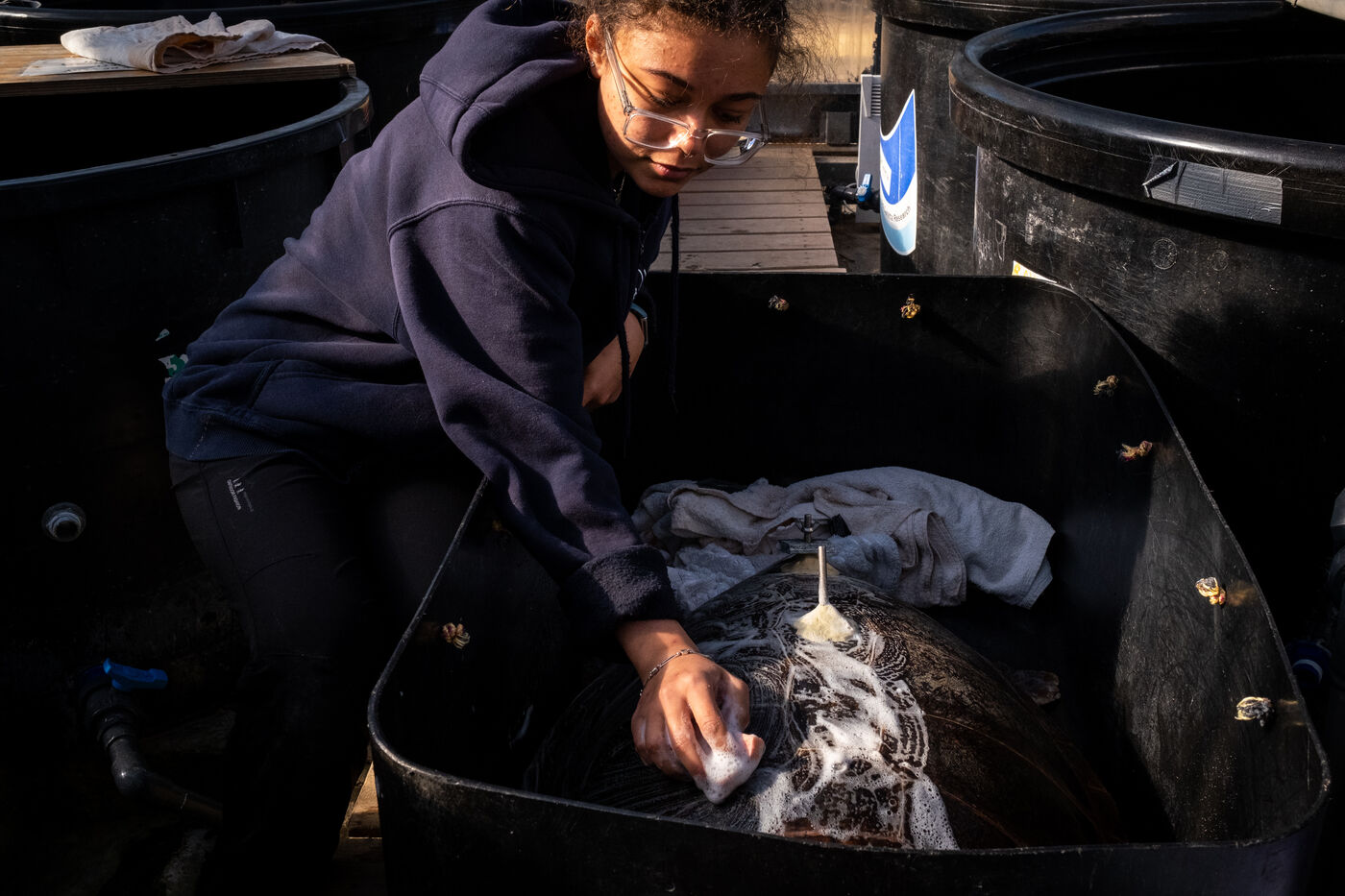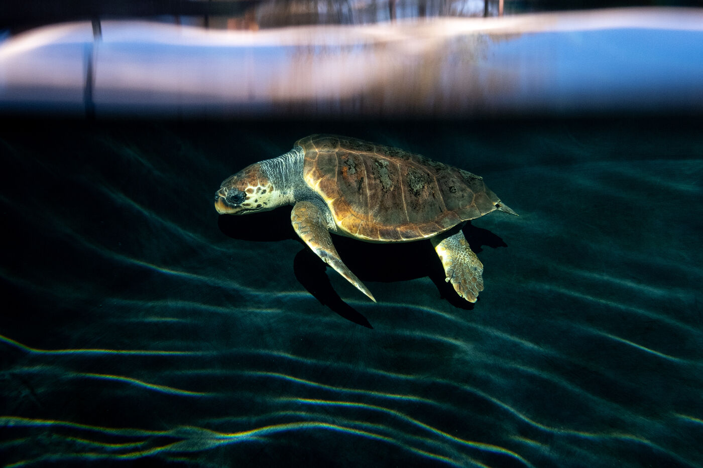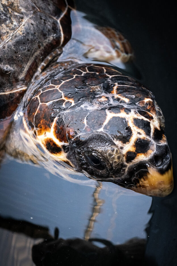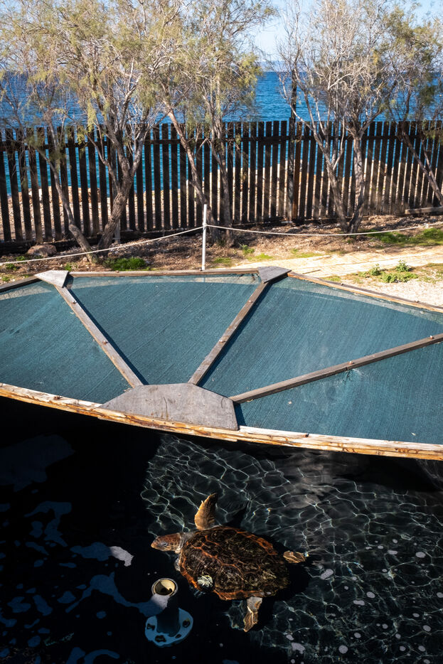 Une fois leur santé stabilisée, les tortues sont transférées dans de grandes cuves profondes afin d'observer comment elles se comportent dans un environnement semblable à la nature avant de les remettre à l'état sauvage. Il y a là Sofia qu'ils racontent avoir déjà sauvée une première fois en 2017 alors blessée par des filets de pêche. Ils l'ont libéré en lui posant une petite plaque d'identité qui leur a permis de la reconnaître quand, quelques années plus tard, elle a été à nouveau retrouvée blessée. « On a dû lui amputer une nageoire car elle avait été frappée violemment sur le côté du corps. Nous avons tout essayé pour la remettre à l'état naturel et fait plusieurs tentatives en mer, mais ça n'a pas fonctionné. Elle sera donc transférée dans un aquarium. »