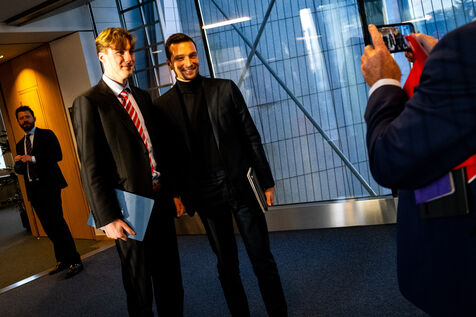 Rencontre entre la Présidente du Parlement Européen Roberta Metsola et le Secrétaire général de l'OTAN (Organisation du traite de l Atlantique nord) Mark Rutte suivi d'un débat sur la sécurité européenne et mondiale entre Mark Rutte et les députés européen, en présence de Jordan Bardella, Président du parti français le Rassemblement National.