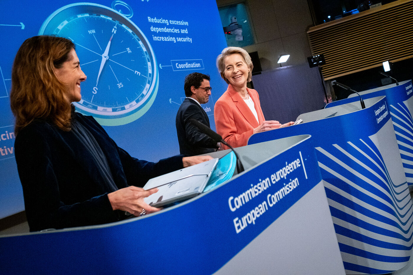 Press conference by President Ursula Von Der Leyen and Vice-President Stéphane Séjourné on the European Union's Competitiveness Compass. The Commission presents the competitiveness compass for Europe to become the place where clean technologies, services and products are invented, while being the first continent to become climate neutral, based on the Draghi report.