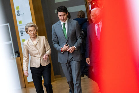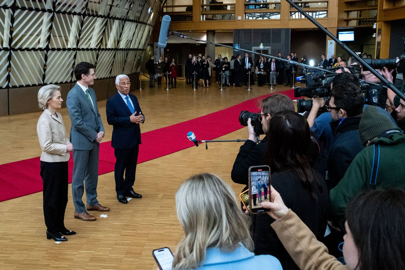 Rencontre entre le Premier ministre du Canada Justin Trudeau et le Président du Conseil Européen Antonio Costa et la Présidente de la Commission Européenne Ursula von der Leyen.