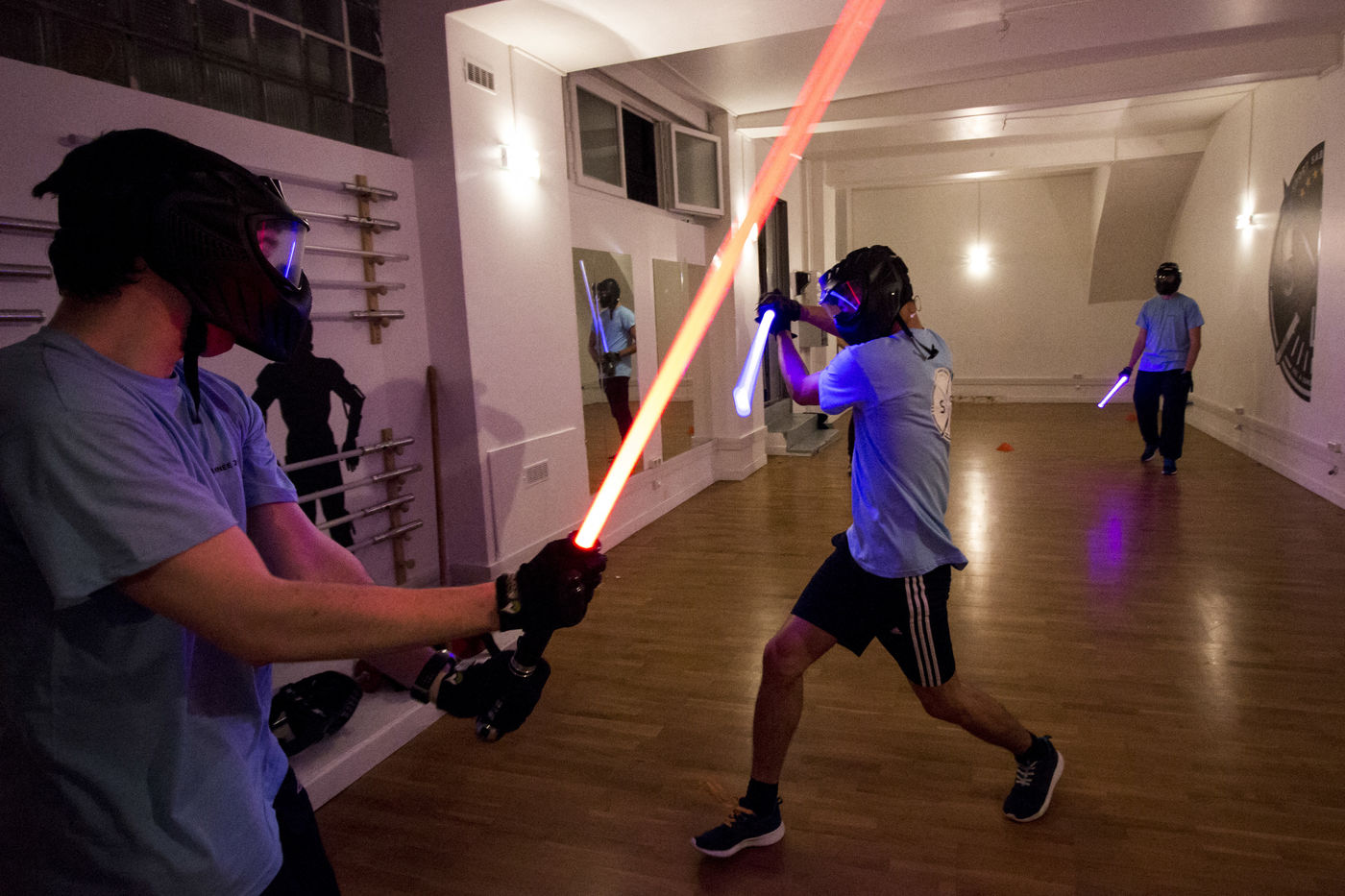 Pour autant, pas question de prendre ce sport à la légère: l'entraînement se débute par un échauffement très physique et les combats se font équipés de protections. Les techniques enseignées se rapprochent de celles du Kendo ou de l'Escrime mais sont réalisées avec ces bâtons lumineux. On se replonge dans l'univers de science-fiction créé par Georges Lucas.