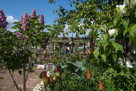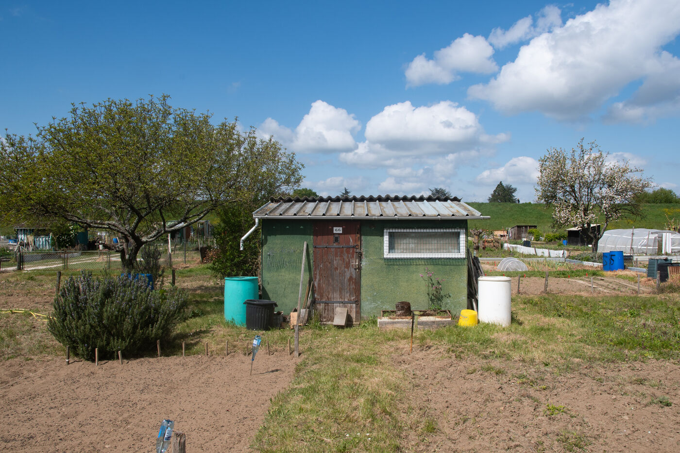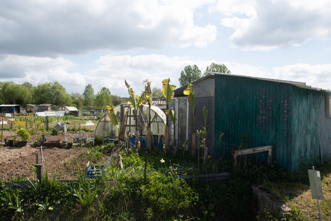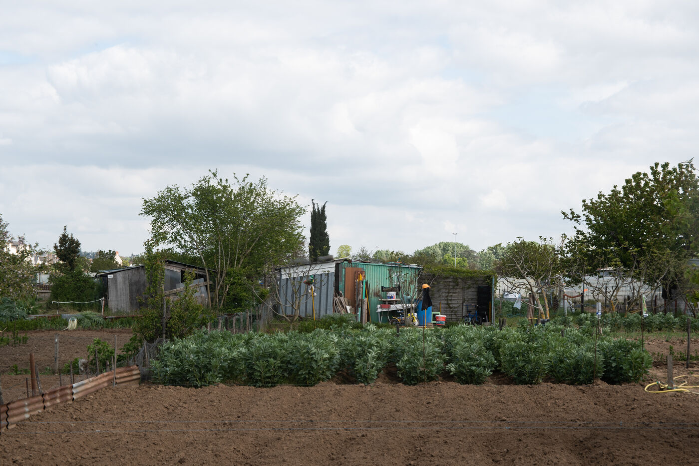Plantes et cabanons de jardins des jardins familiaux, jardins partagés à Blois en avril 2024.