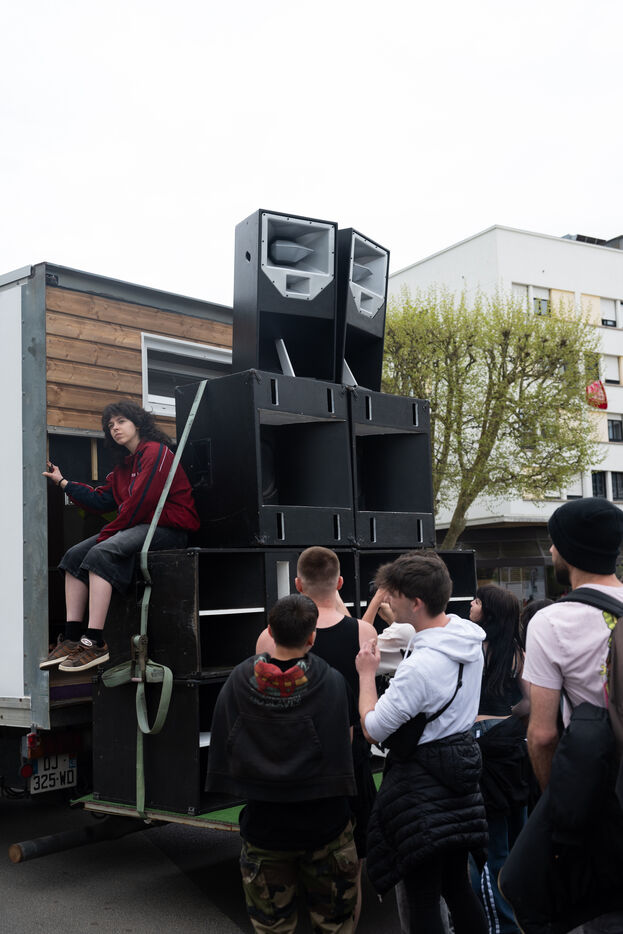 La manifestive de Lorient, a festive demonstration in defence of techno culture and free partying, also known as ‘teuf’, ‘rave party’ and ‘free party’, and against the systematic repression suffered by the movement. Several hundred people demonstrated and danced around three lorries fitted with boxes in the streets of Lorient on 12 April 2025.
