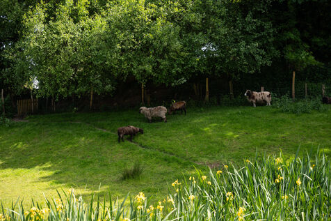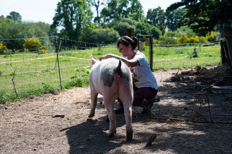 Wild and domestic animals live together in this beautiful space. The two donkeys, the two ponies and the hens live freely on the site. There are also pigs, goats, sheep, cows, guinea pigs, a rabbit, two ferrets, a dog and cats. All the animals have been rescued, some from court seizures, abandonment, mistreatment or the dairy industry, like these lambs that arrived as babies and were bottle-fed. Although grazing land is loaned by the local authority, the site is at capacity and cannot accommodate any more animals. Volunteers, some of them permanent, help to keep the sanctuary running smoothly and feed the animals.