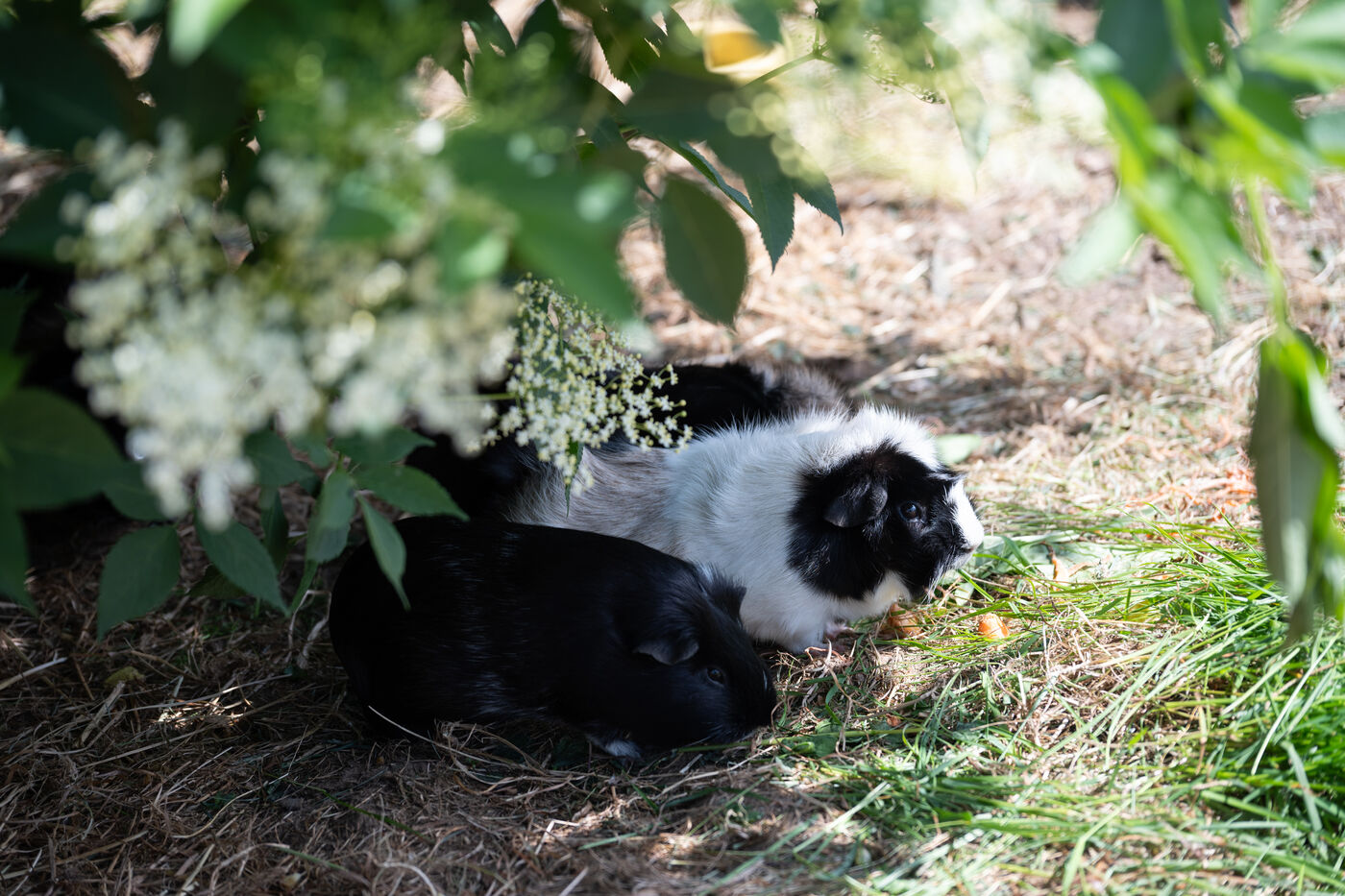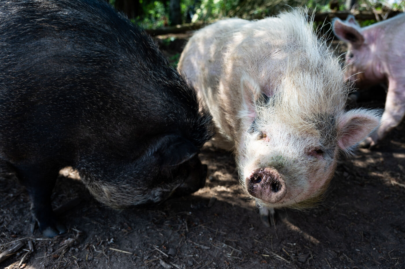 Les animaux sauvages et domestiques cohabitent dans ce bel espace. Les deux ânes, les deux poneys ainsi que les poules vivent en liberté sur le site. On y trouve également des cochons, des chèvres, des moutons, des vaches, des cochons d’Inde, un lapin, deux furets, un chien et des chats. Tous les animaux sont issus de sauvetages, certains proviennent de saisies judiciaires, d’abandons, de cas de maltraitance ou encore de l’industrie laitière, comme ces agneaux arrivés bébés et nourris au biberon. Bien que des pâtures soient prêtées par la commune, le site est en limite de capacité et ne peut accueillir davantage d’animaux. Des bénévoles, dont certains permanents, participent au bon fonctionnement du sanctuaire et au nourrissage des animaux.