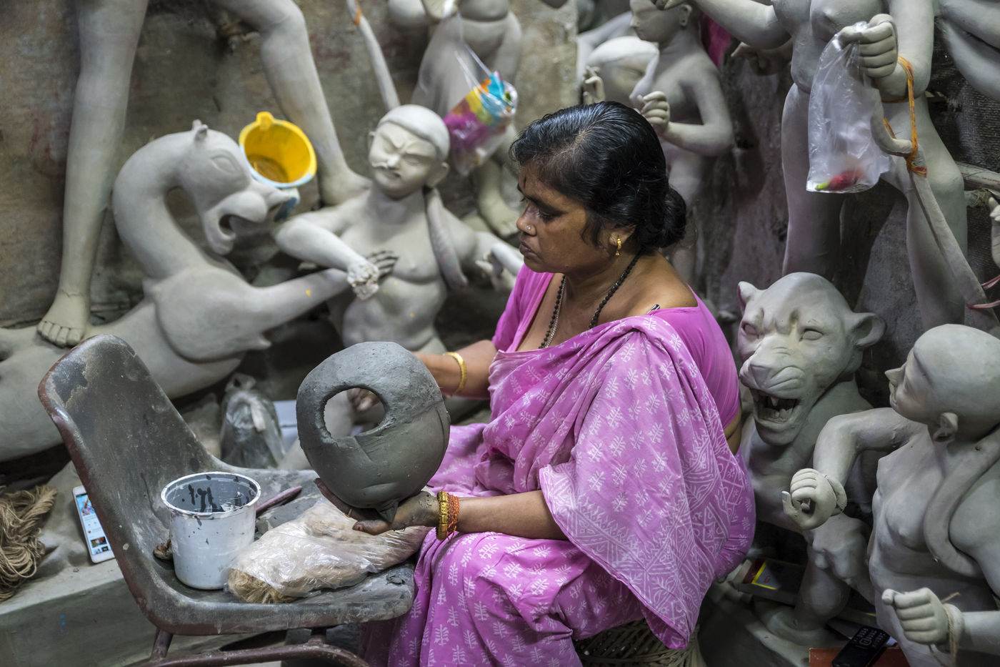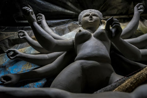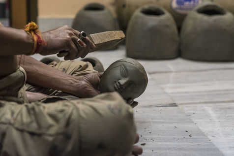 Meme si la fabrication d idoles a generalement ete l oeuvre des hommes, ces dernieres annees, les femmes sont egalement autorisees a construire les idoles. Les potiers utilisent des materiaux respectueux de l environnement et reutilisables pour l idole. Le bambou et la paille sont utilises pour la structure et la stratification se fait avec de l argile. Ce qui est particulierement interessant et intrigant est un rituel habituel de melanger l argile d un bordel avec l argile de la fabrication d idoles. L idole serait incomplete sans utiliser l argile ou le punya maati (terre benie) du bordel ou nishiddopalli (territoire de fordibben). Kumartuli utilise le punya maati de Sonagachi, qui est la plus grande zone de lumiere rouge d Asie.