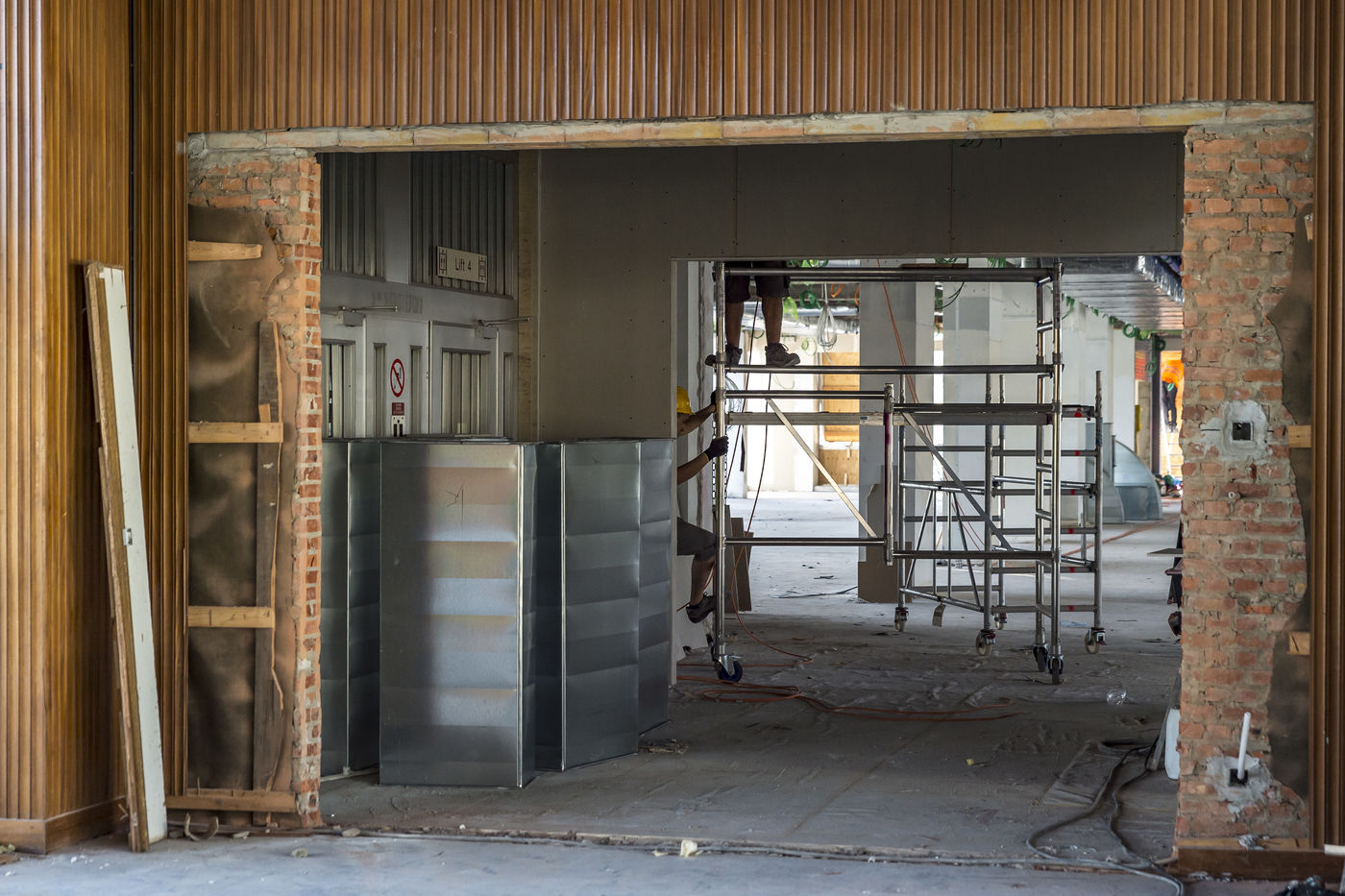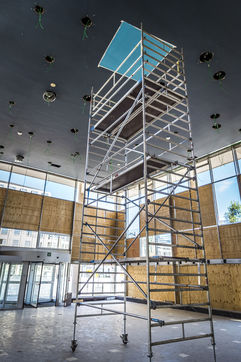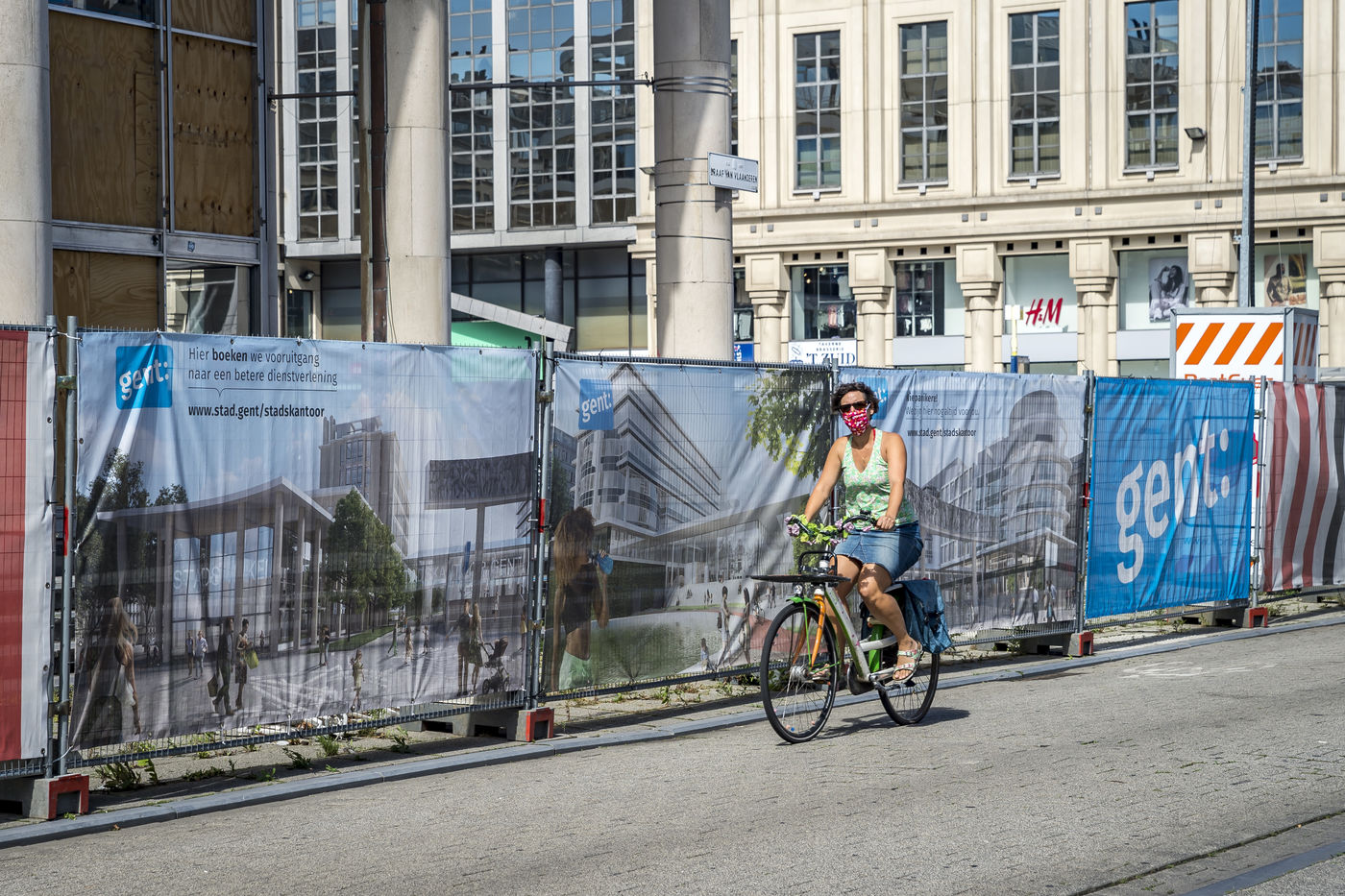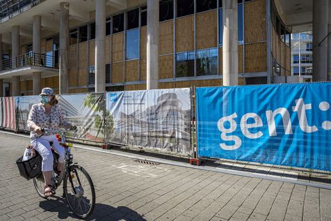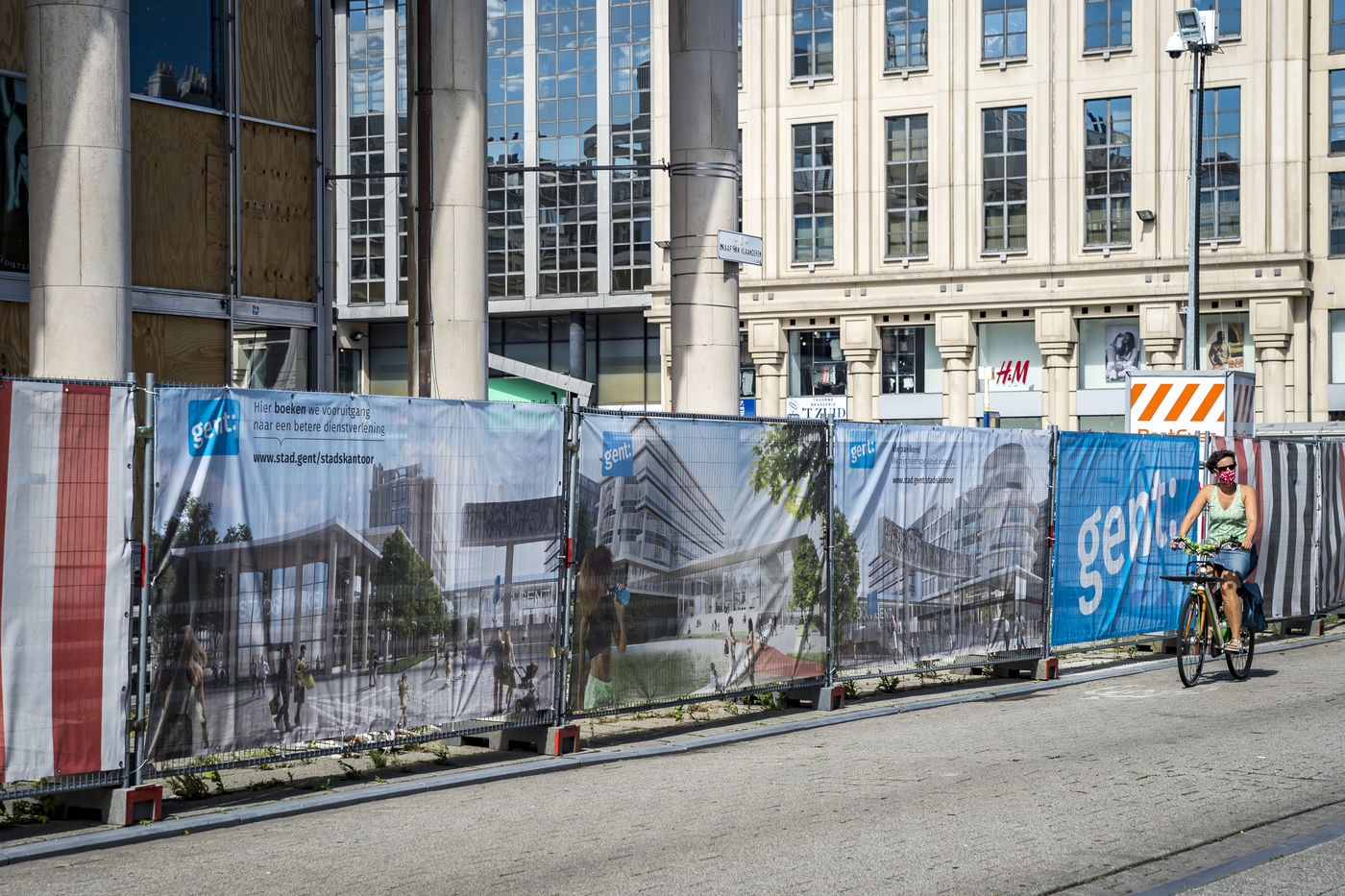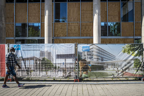 Since the beginning of 2020 are going on the renovation works of the old city library of the city of Ghent in Woodrow Wilsonplein. Today, 21 august 2020 the work keeps going on till the end of 2020 when the renovation works must be completed. Part of the work are already done. The structural work of the tunnel that connects the car park under the current AC Zuid and the basement of the old city library and a data center in the basement that will create an ultra-modern IT infrastructure with the data center on the Prins Filip campus. Along with innovation also the works pay attention to the heritage. The old city library, designed by the well-known Ghent architect Geo Bontick in 1955, is indeed considered a valuable historical patrimony. Authentic heritage elements are therefore being restored. Among other things, the wooden parquet and paneling in the Achilles Musschezaal on the second floor, and the starry sky in the former entrance hall are carefully restored. A conference center is being set up in the Achilles Musschezaal and there will be plenty of space for workplaces to do meetings and collaboration.