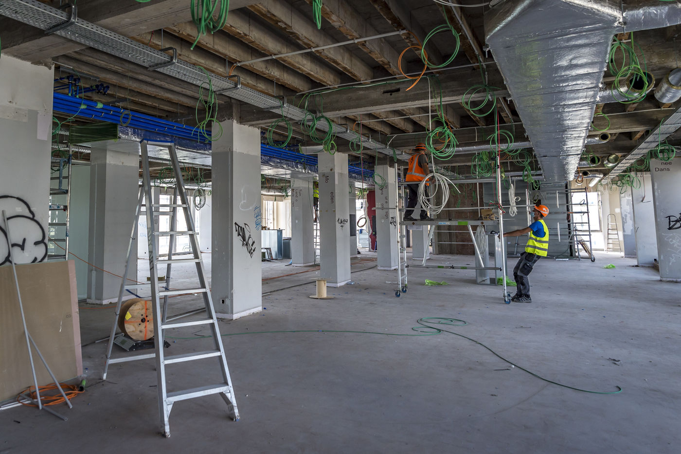 Depuis le debut de 2020, les travaux de renovation de l ancienne bibliotheque de la ville de Gand a Woodrow Wilsonplein sont en cours. Aujourd hui 21 aout 2020, les travaux se poursuivent jusqu a fin 2020, date a laquelle les travaux de renovation doivent etre acheves. Une partie du travail est deja terminee. Le gros oeuvre du tunnel qui relie le parking sous l actuel AC Zuid et le sous-sol de l ancienne bibliotheque de la ville et un data center en sous-sol qui permettront de creer une infrastructure informatique ultra moderne avec le data center du campus Prins Filip. Parallelement a l innovation, les oeuvres font egalement attention au patrimoine. La bibliotheque de la vieille ville, concue par le celebre architecte gantois Geo Bontick en 1955, est en effet consideree comme un patrimoine historique precieux. Des elements patrimoniaux authentiques sont donc en cours de restauration. Entre autres, le parquet et les boiseries de l Achille Musschezaal au deuxieme etage, et le ciel etoile de l ancien hall d entree sont soigneusement restaures. Un centre de conference est en cours d installation dans l Achille Musschezaal et il y aura beaucoup d espace pour les lieux de travail pour les reunions et la collaboration.