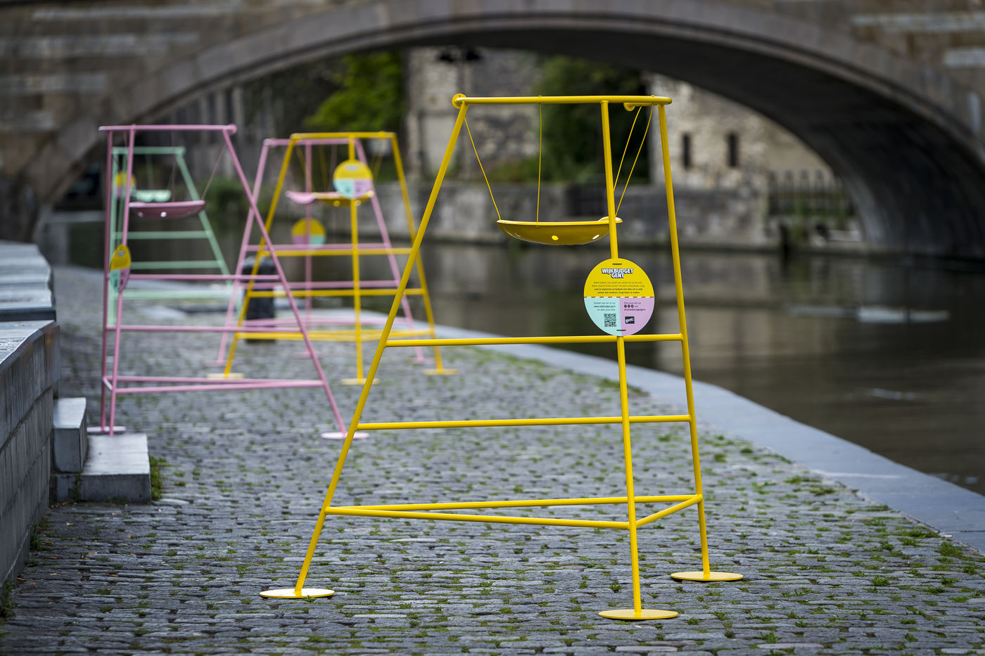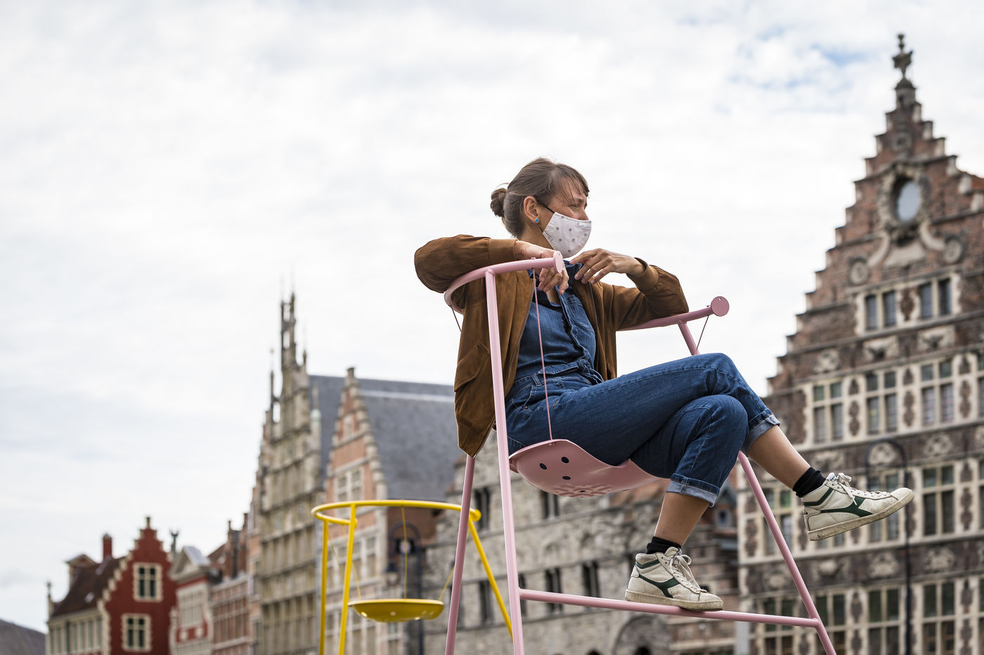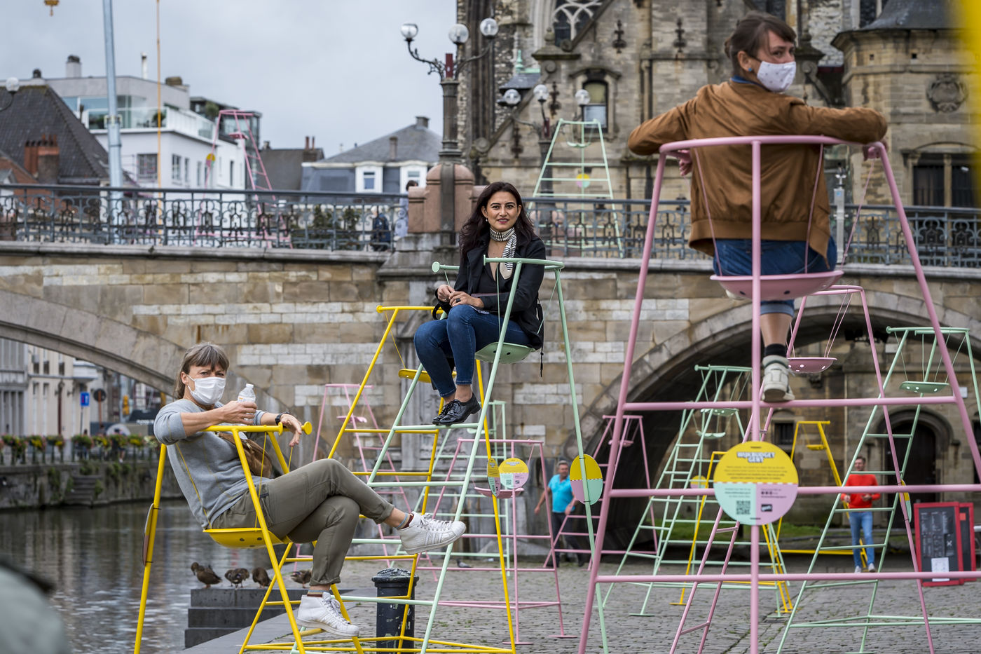 On 4th September happened the official launch of the wijkbudget the neighborhood budget. Fifty colossal, colorful chairs designed by Lien Van Deuren were be set up on Graslei and Korenlei. Alderman of Participation Astrid De Bruycker gave more information about the budget and on the same day, all chairs move to the eleven neighborhoods that will be discussed first. Local residents can move them, sit on them, and thus in a symbolic way gain inspiration for creative ideas for their neighborhood looking the city from various new different angles. Within the framework of the neighborhood budget, the City of Ghent is making 6.25 million euros available for the 25 Ghent neighborhoods.