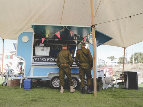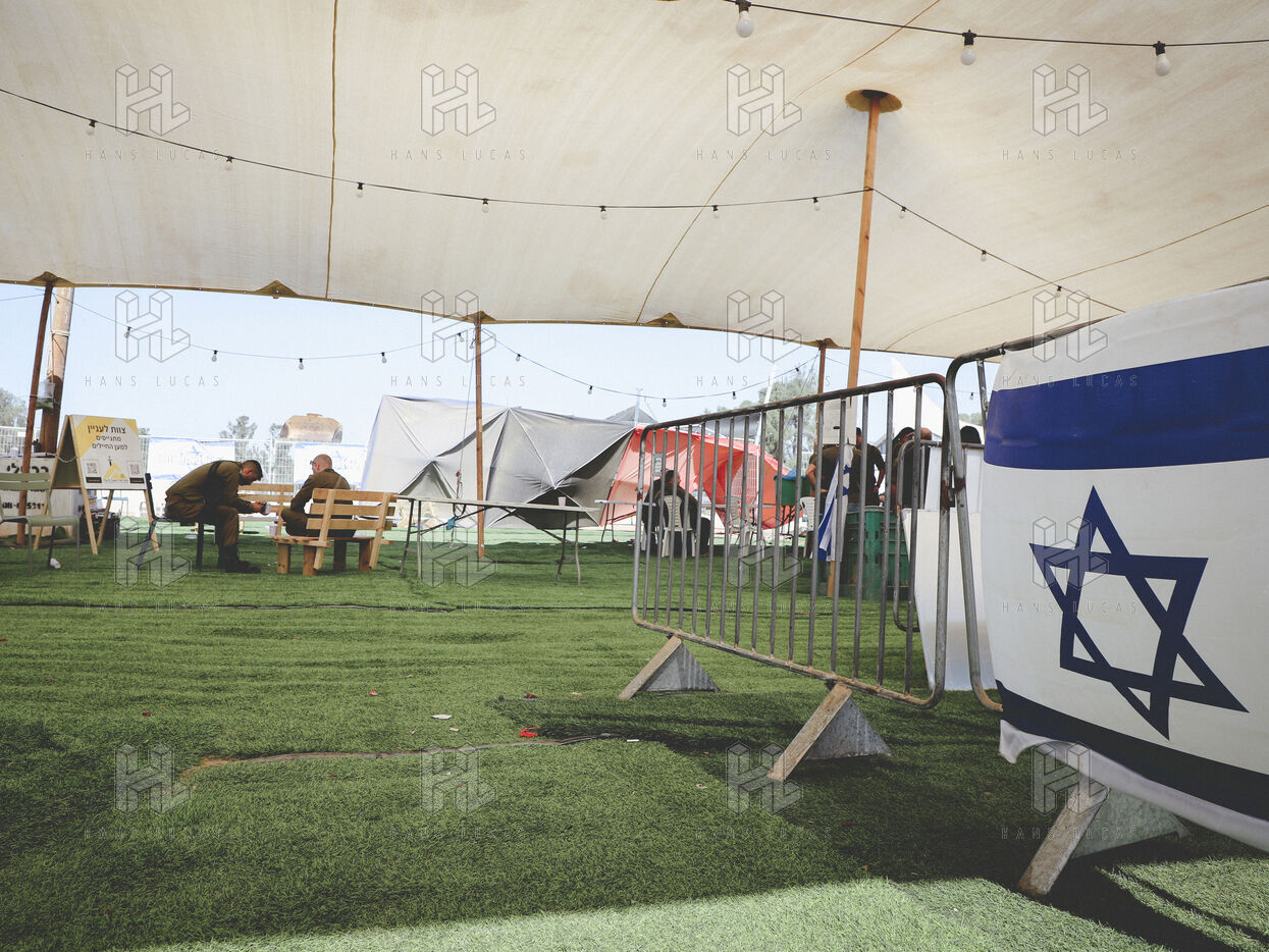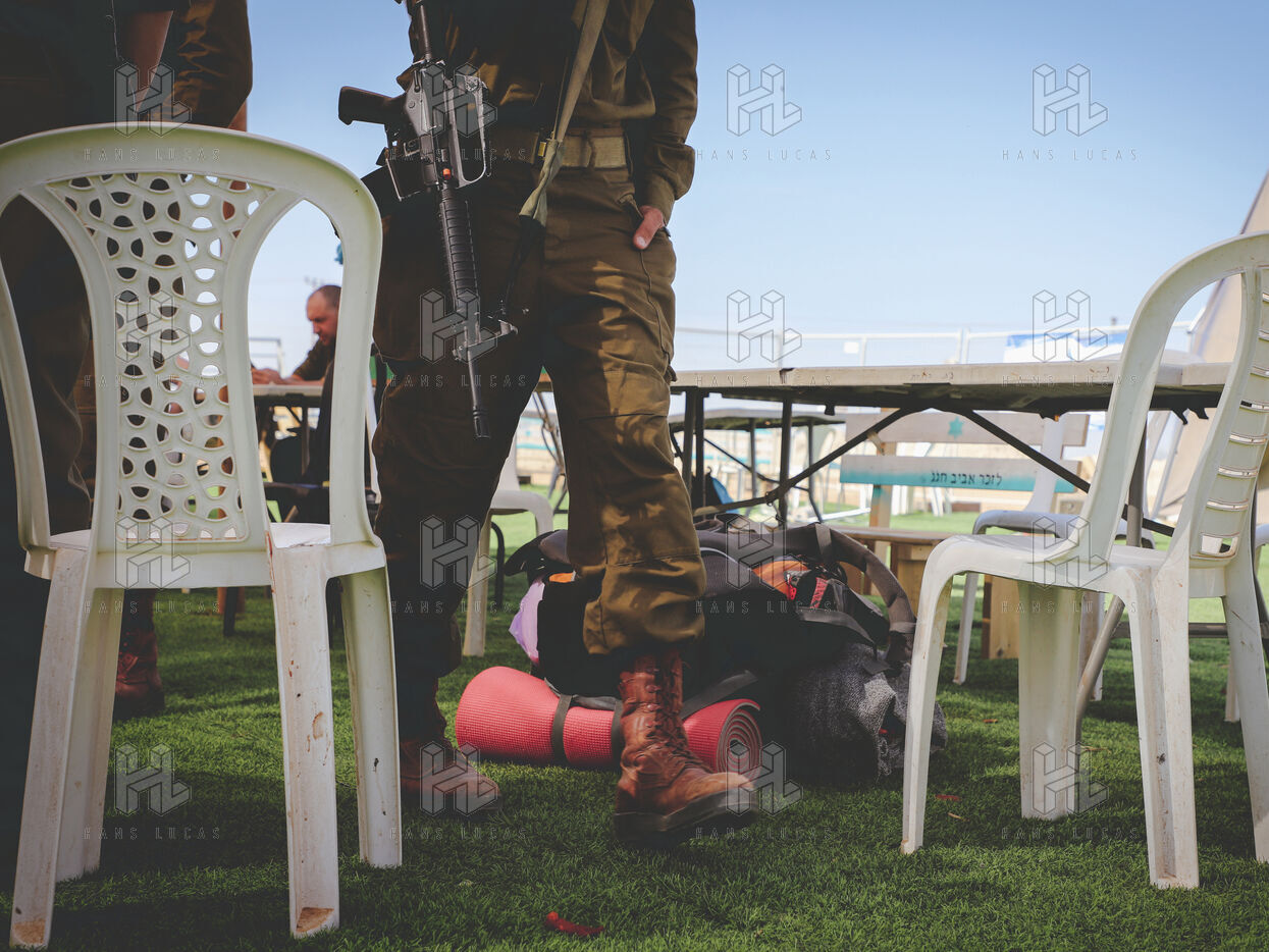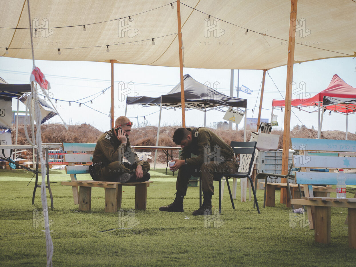 Soldiers camp a few kilometers from the Gaza border. They return from combat, drained — voices low on the phone, waiting in line at a makeshift food truck, silence wrapped in fatigue.