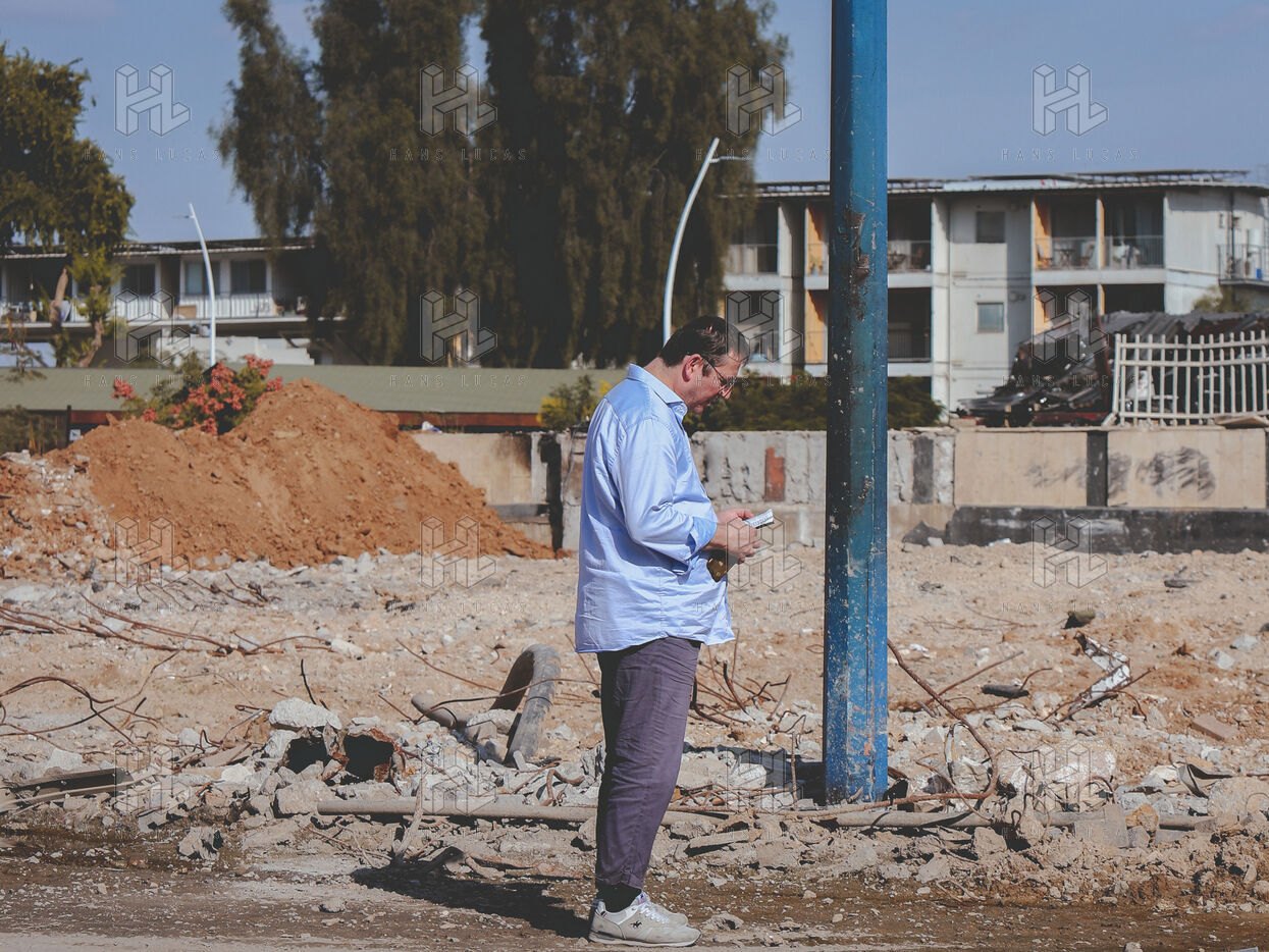 In Sderot, before the remains of a police station torn to the ground, a man opens his sacred book. He begins a prayer for the lost, standing alone in the dust.