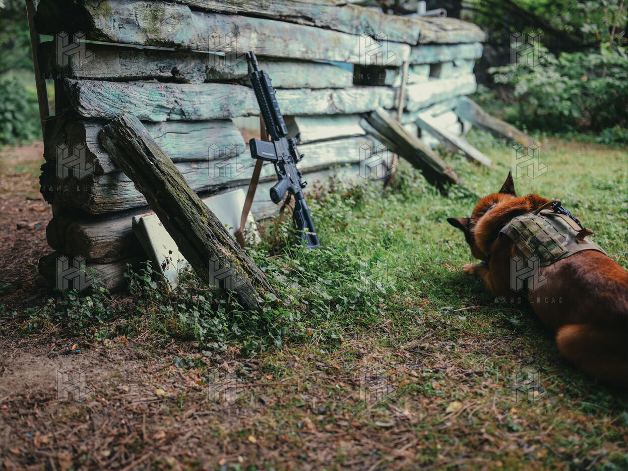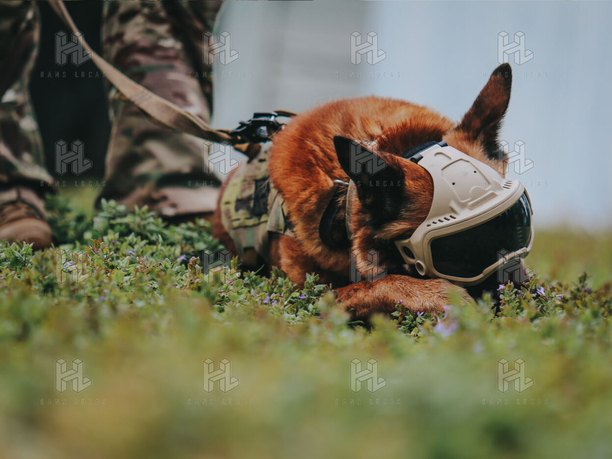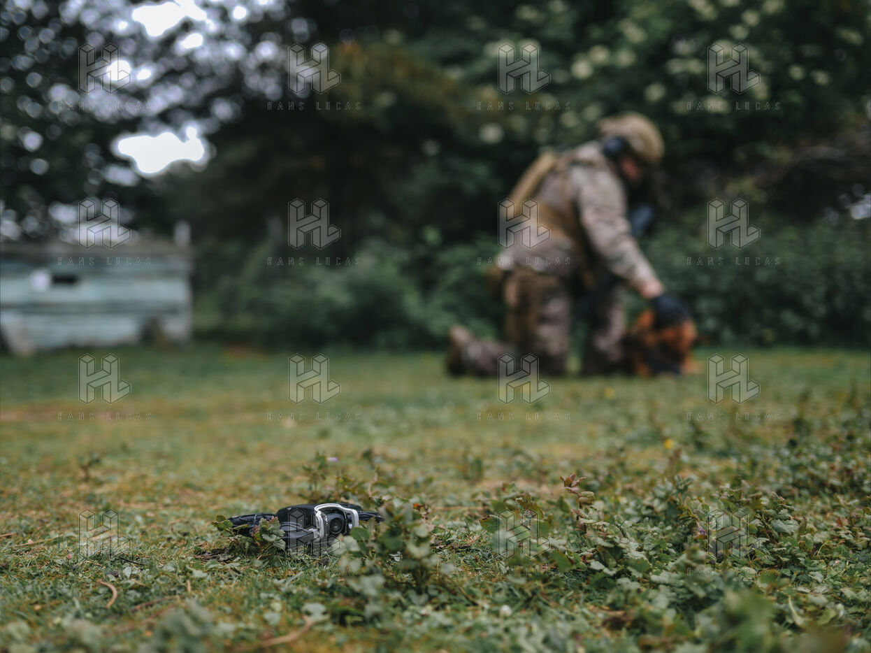 On the warm tarmac of late morning, a dense silence surrounds the operation. Three men, three dogs. And in the sky, a drone hovering quietly. On the ground, Peyo waits — still, focused. Harnessed, wearing tactical goggles, he anticipates the signal. At his side, his handler, Sergeant-Chef Dorian, barely whispers.