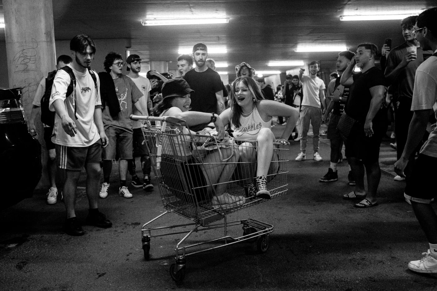 France, Strasbourg, 2021-06-21. Students gathered in a campus parking lot for a project X. Photography by Mathilde Cybulski / Hans Lucas.