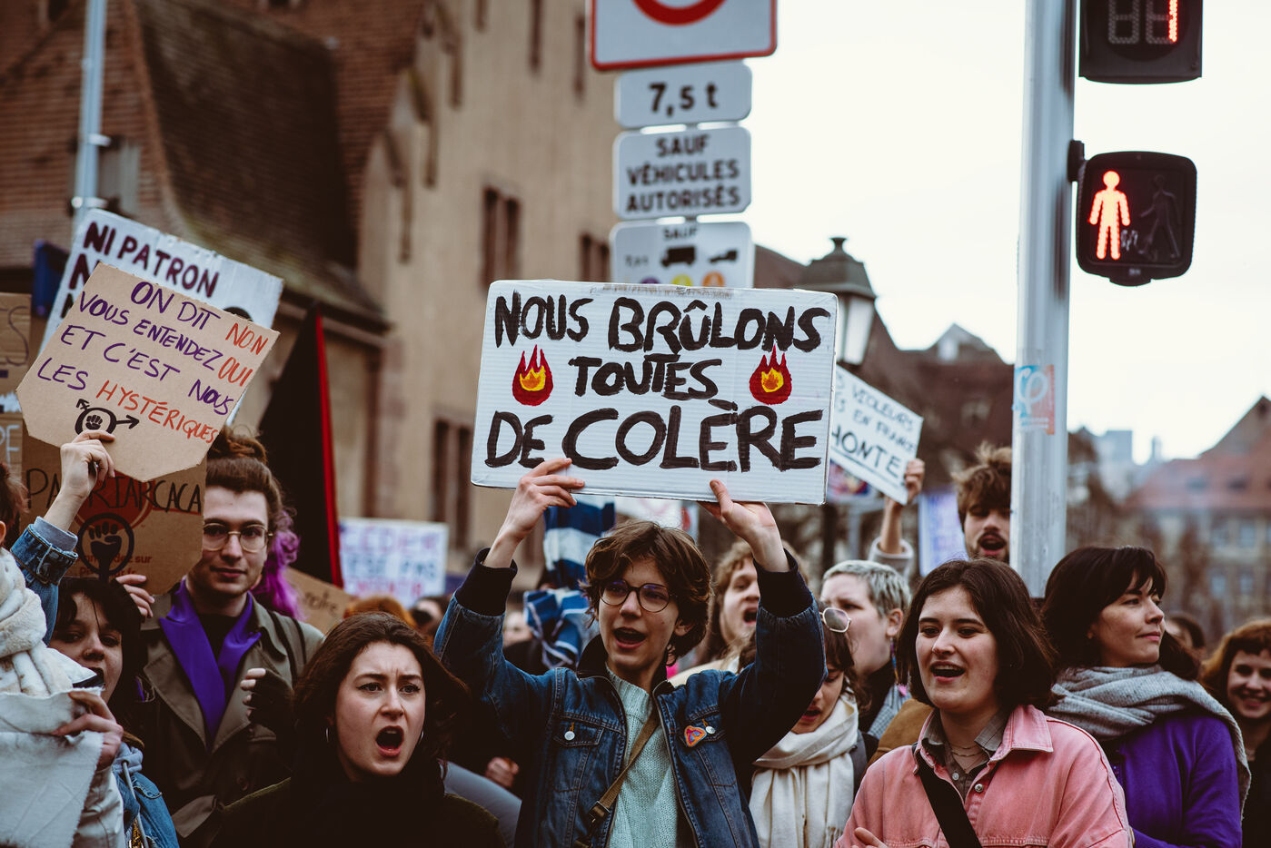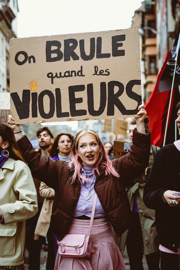 France, Strasbourg, 03-08-2023. Marche féministe à l'occasion de la journée de lutte pour le droit des femmes. Plus de 2000 personnes ont défilé. Tête de cortège en mixité choisie, suivie d'un cortège mixte puis des syndicalistes. Photo Mathilde Cybulski / Hans Lucas.