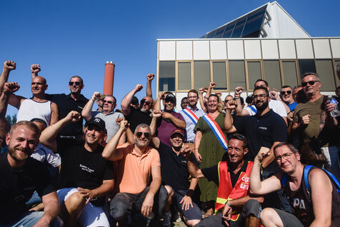 France, Illkirch-Graffenstaden, 05-09-2023. Mathilde Panot and Emmanuel Fernandes, LFI deputies, support the strikers at the Clestra factory. Employees have been on strike for over two months following the company's takeover by the Jestia group. Photo Mathilde Cybulski