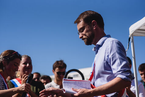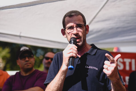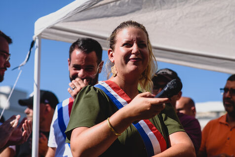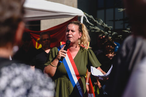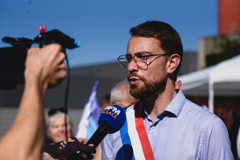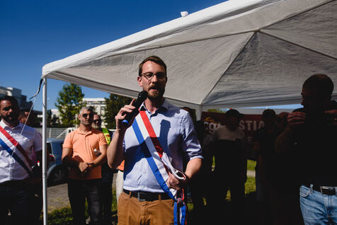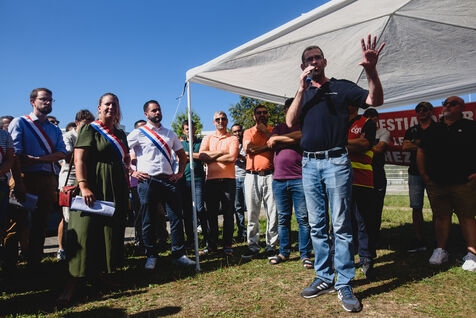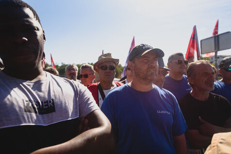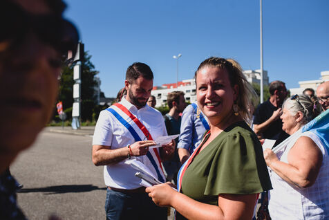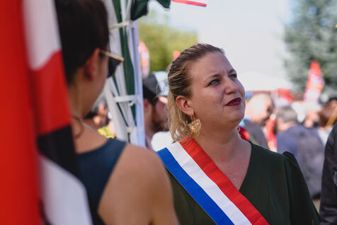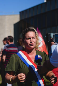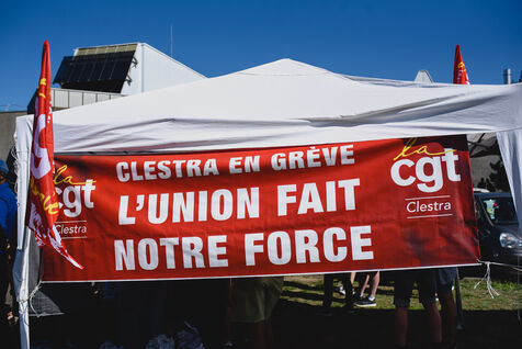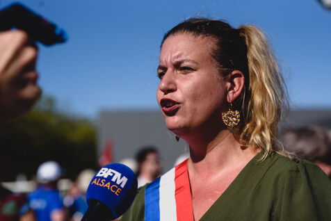 France, Illkirch-Graffenstaden, 05-09-2023. Mathilde Panot et Emmanuel Fernandes, députés LFI, apportent leur soutient aux grevistes de l'usine Clestra. Les employés sont en greve depuis plus de deux mois suite à la reprise de l'entreprise par le groupe Jestia. Photo Mathilde Cybulski