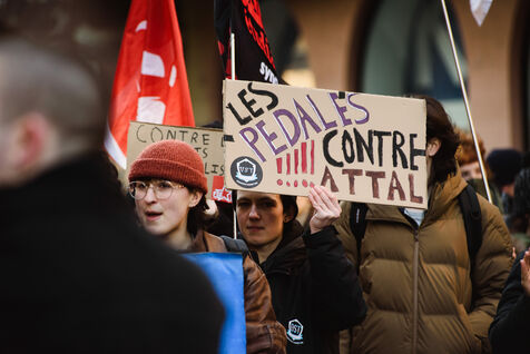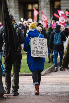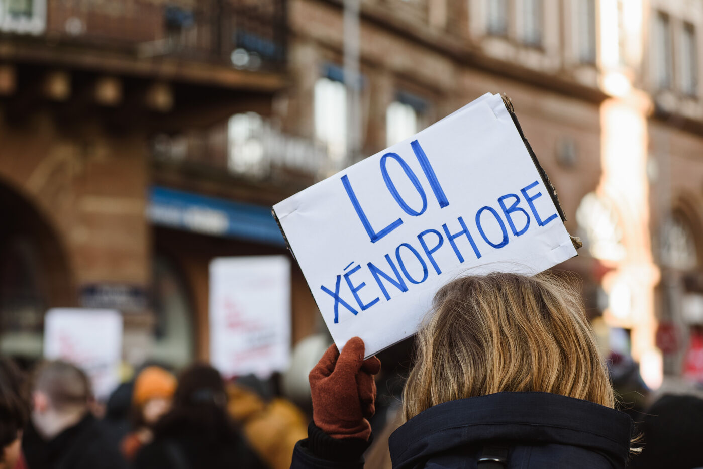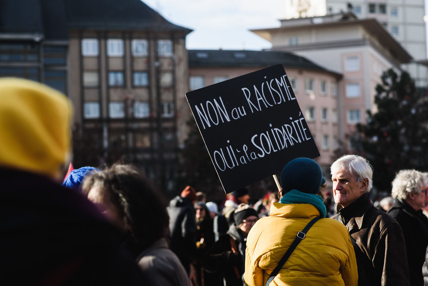 France, Strasbourg, 21-01-24. Around 3,000 people took part in the demonstration against the law on asylum and immigration. The procession started from Place Kleber after a speech by Mme Barseghian, Mayor of Strasbourg, to join Place de la République. Photo Mathilde Cybulski / Hans Lucas.
