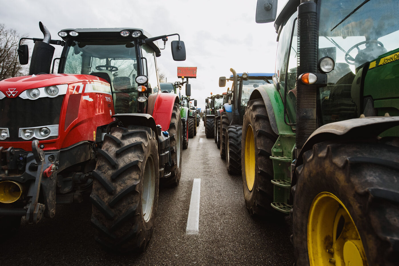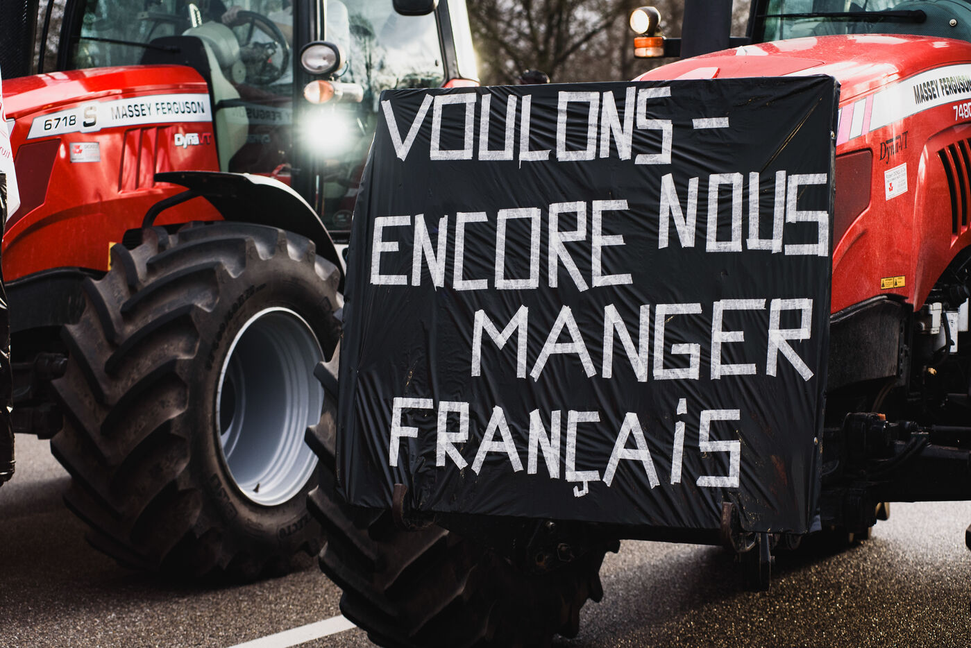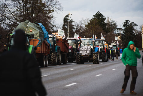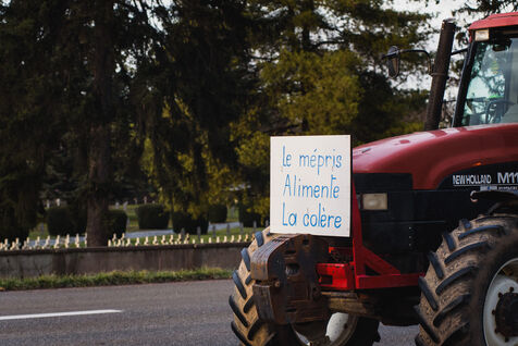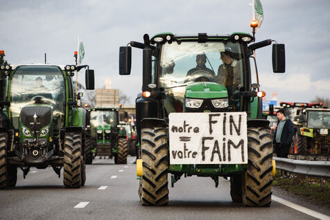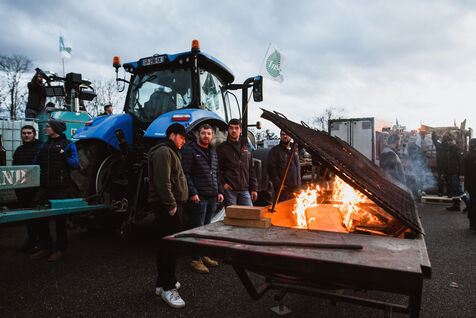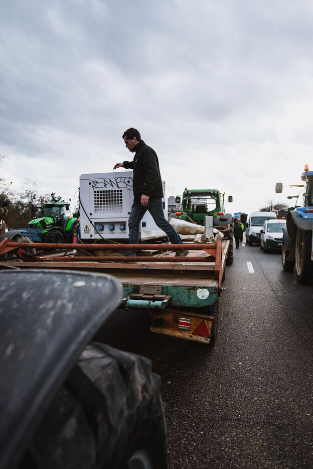 France, Strasbourg, 24-01-24. Blockade of the A35 freeway for farmers' mobilization. Several hundred tractors block the freeway to denounce the new environmental standards that are undermining the profession. Photo Mathilde Cybulski / Hans Lucas.