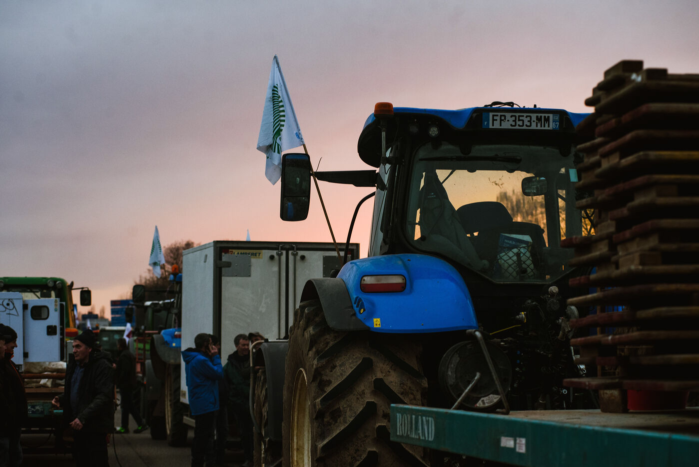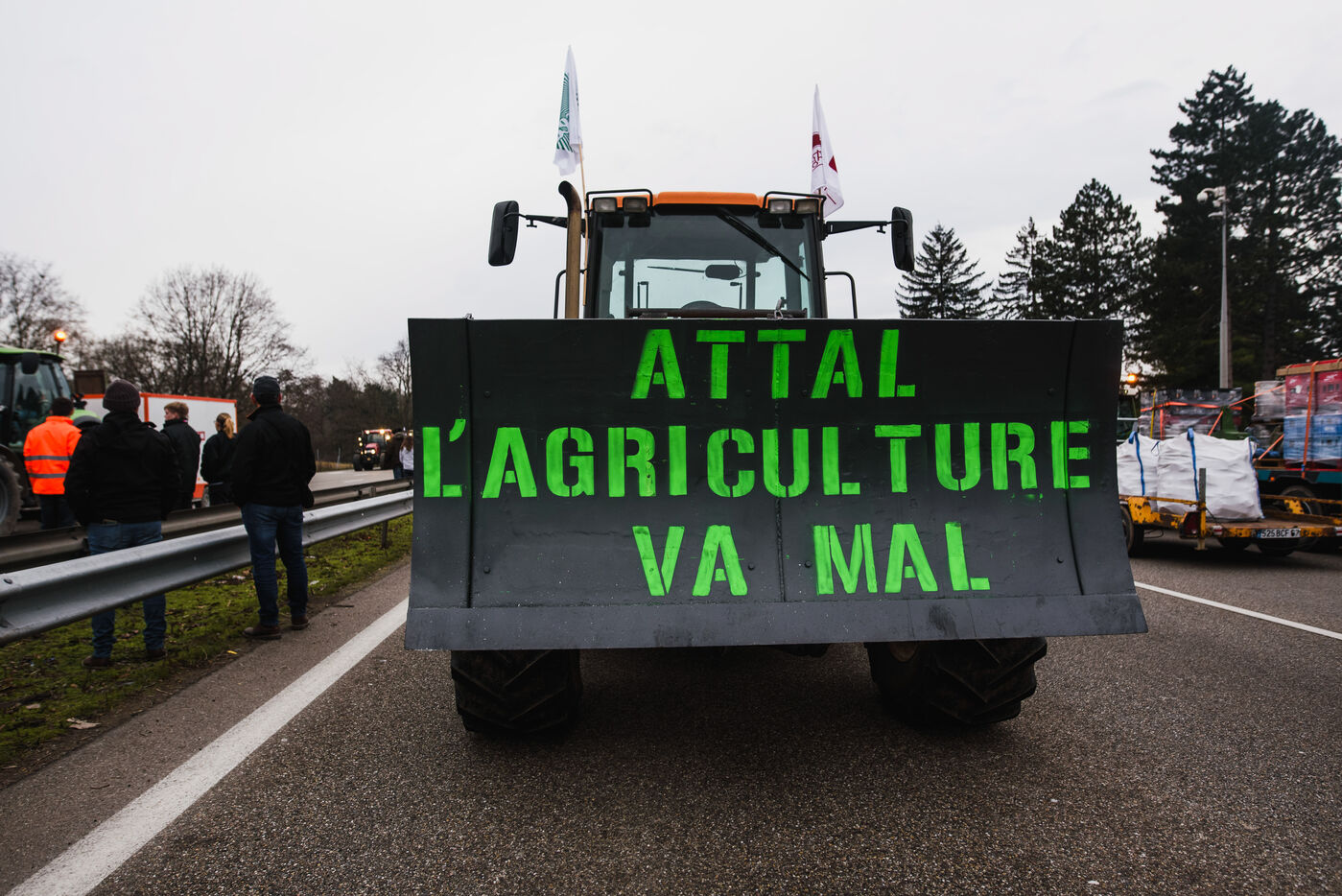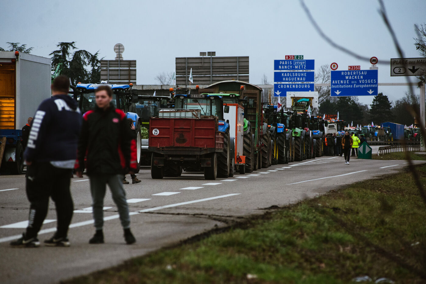 France, Strasbourg, 30-01-24. Farmers block the M35 again. Even more numerous than at the first blockade, several hundred farmers block the freeway with their tractors and intend to stay overnight. Photo Mathilde Cybulski / Hans Lucas.