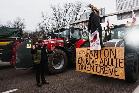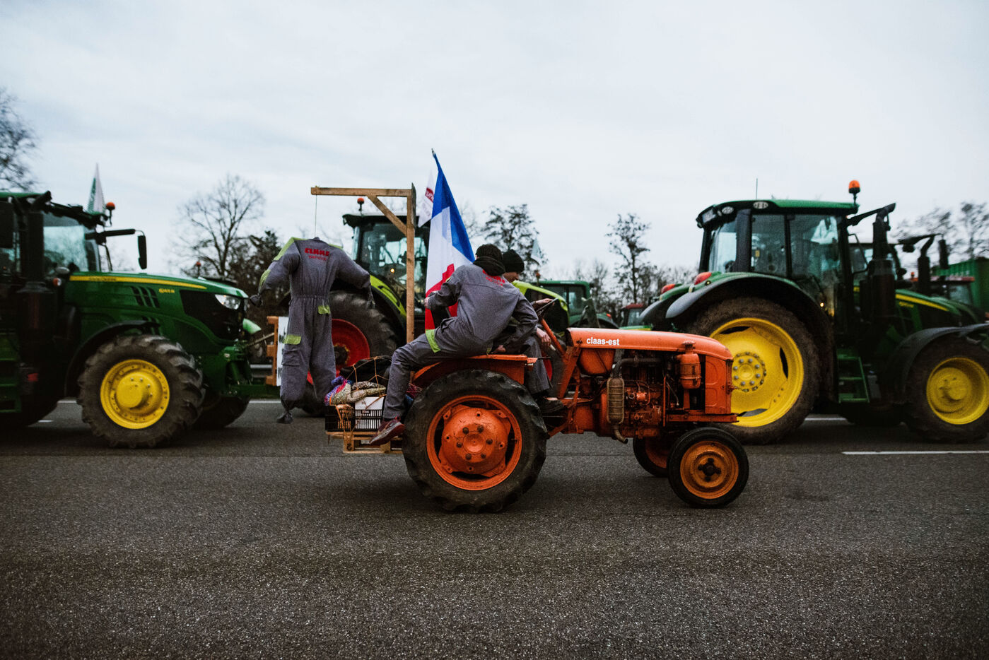 France, Strasbourg, 30-01-24. Nouveau blocage de la M35 par les agriculteurs. Encore plus nombreux que lors du premier blocage, plusieurs centaines d'agriculteurs bloquent l'autoroute avec leurs tracteurs et comptent y passer la nuit. Photo Mathilde Cybulski / Hans Lucas.