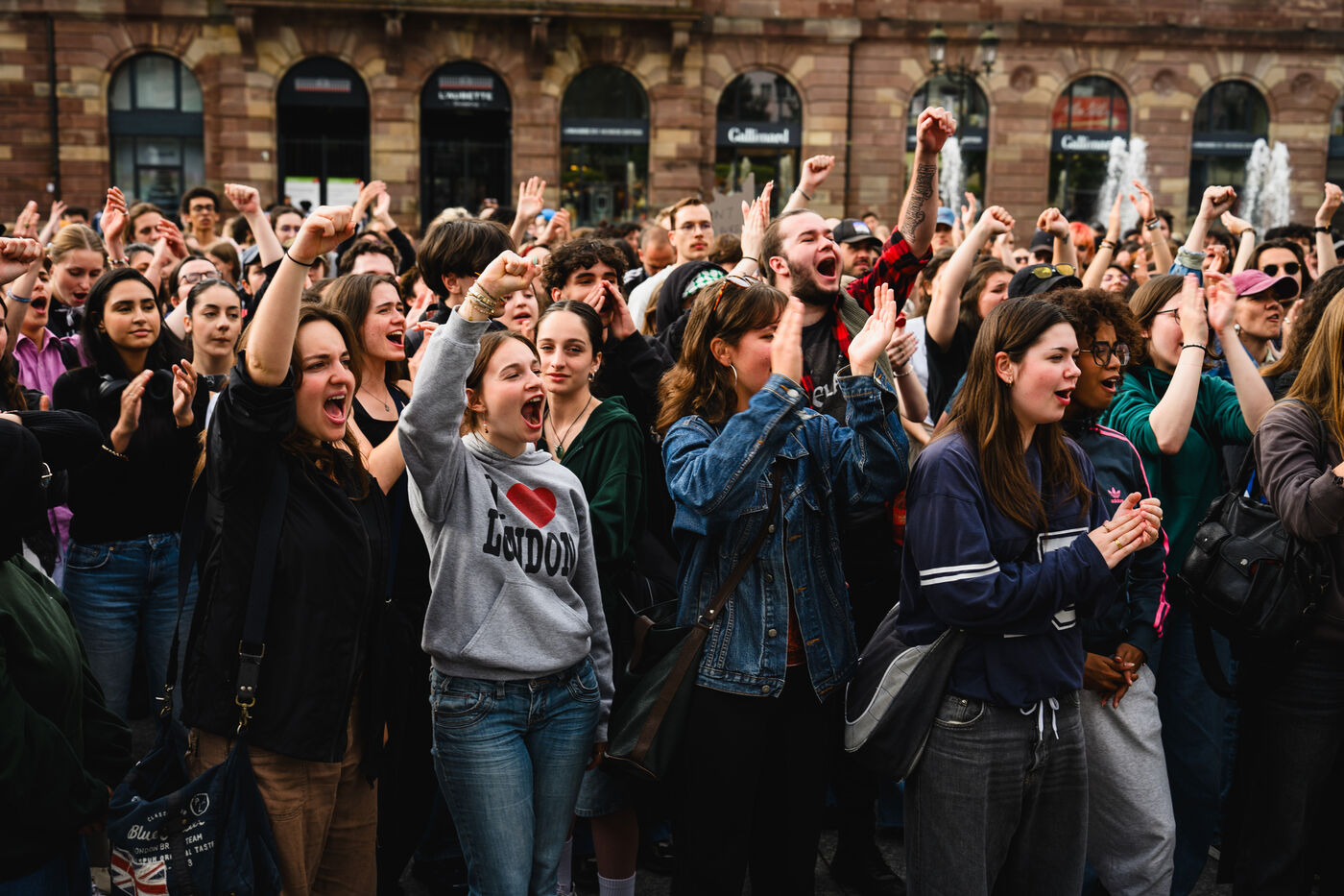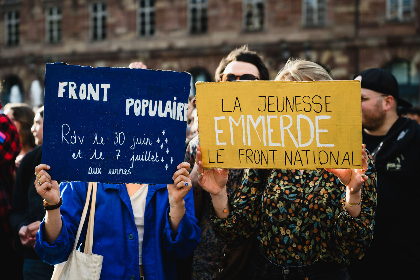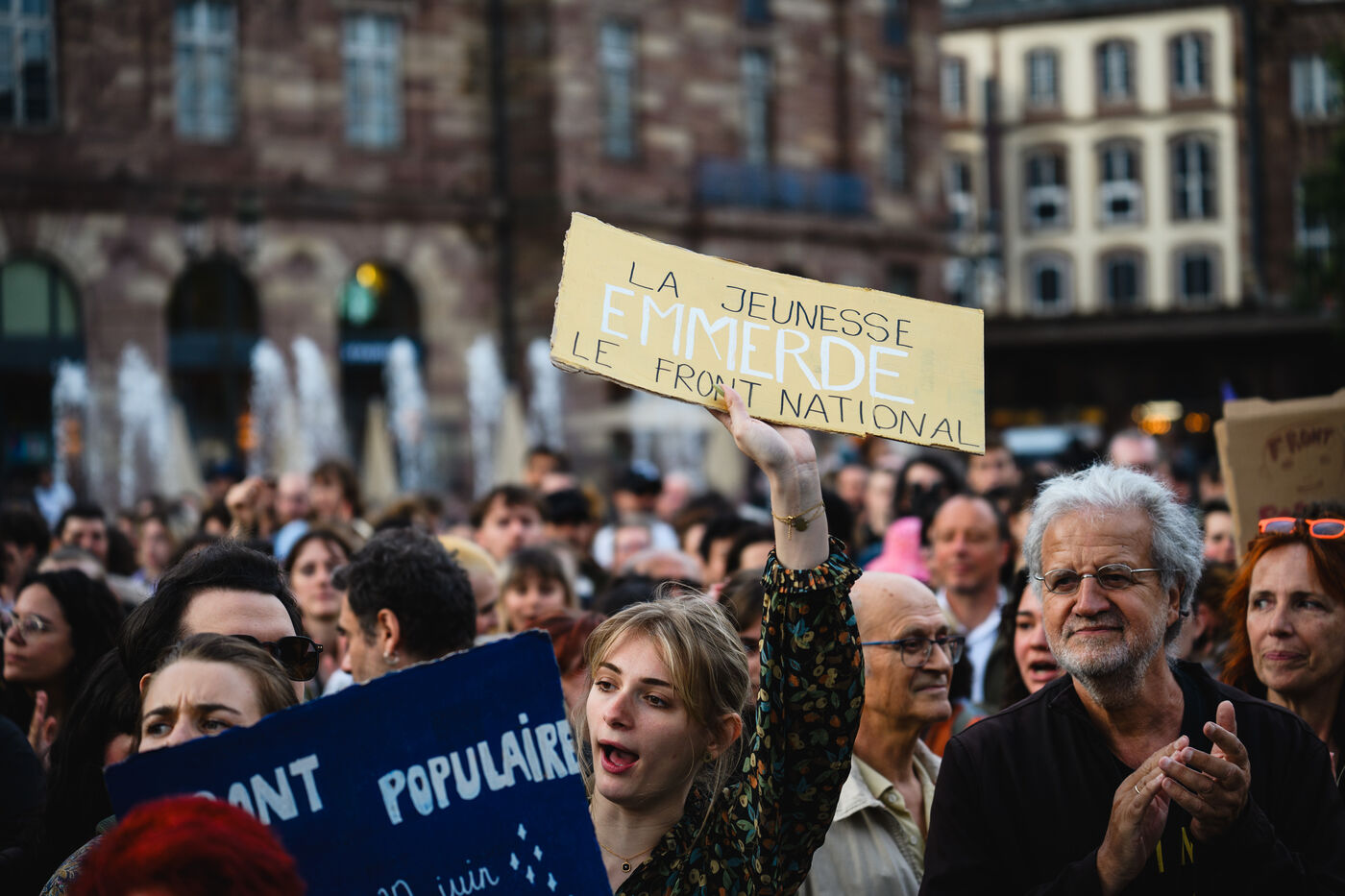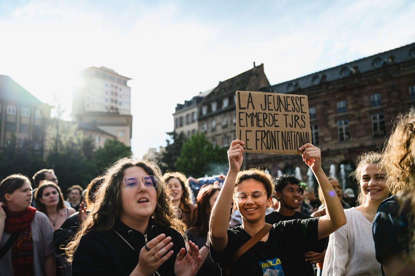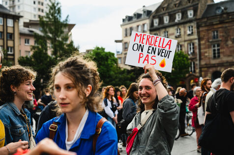 Manifestation spontanee contre l extreme droite a Strasbourg, dans l'est de la France, le 10 juin 2024. La manifestation a eu lieu au lendemain des elections europeennes alors que le rassemblement national, parti d extreme droite francais, arrive en tete.