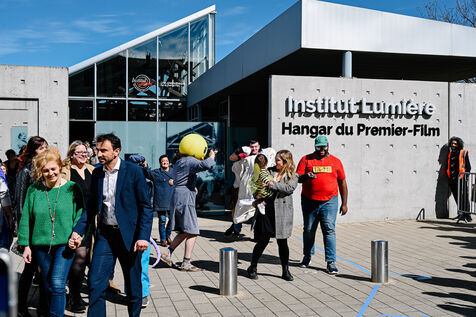 Pour l’occasion, des figurants ont été invités à rejouer la scène mythique de la sortie des ouvrières et ouvriers, redonnant vie à ce plan fondateur de l’histoire du cinéma.