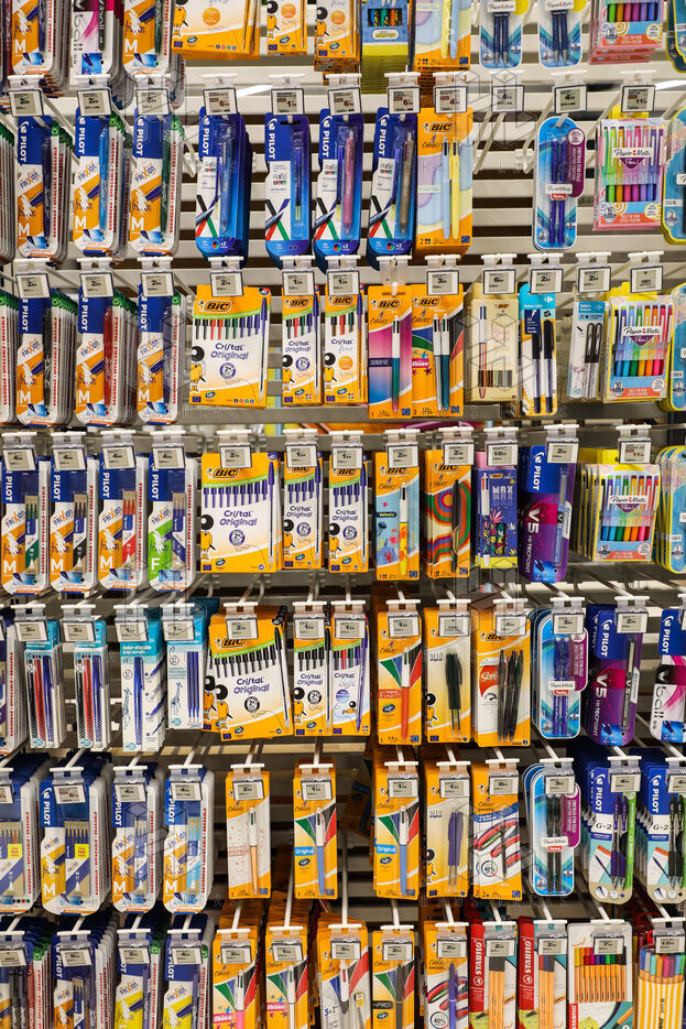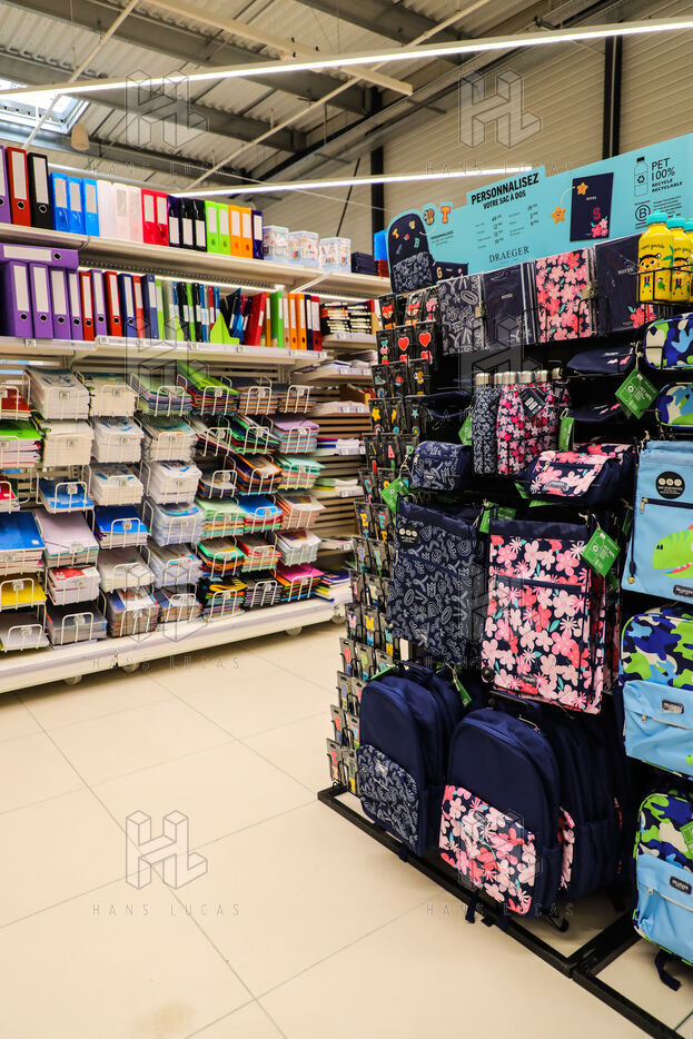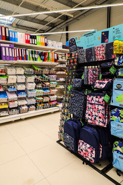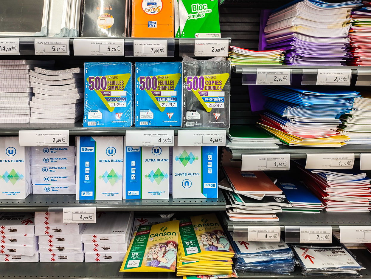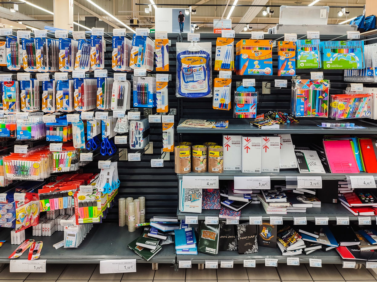 A section of school supplies for the start of the school year in September in a supermarket in the Aude, Côte du midi.