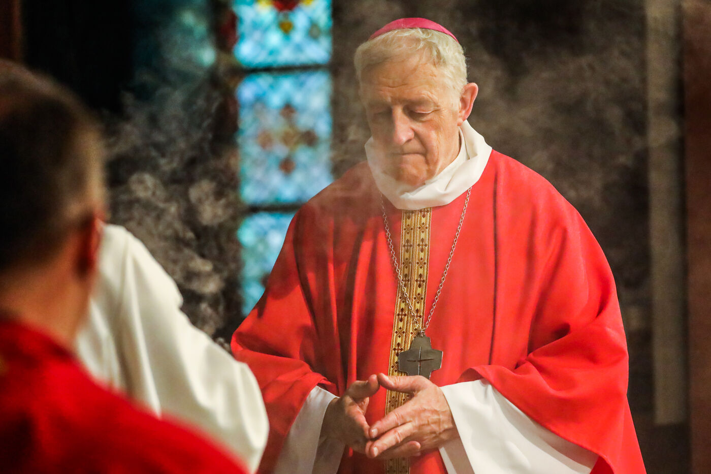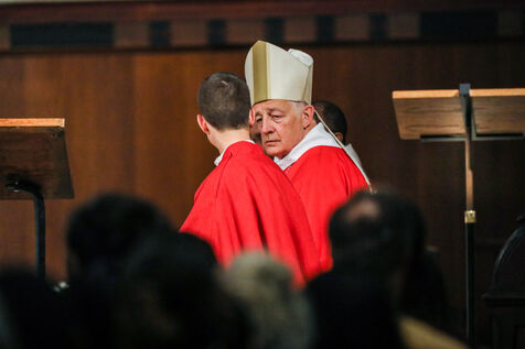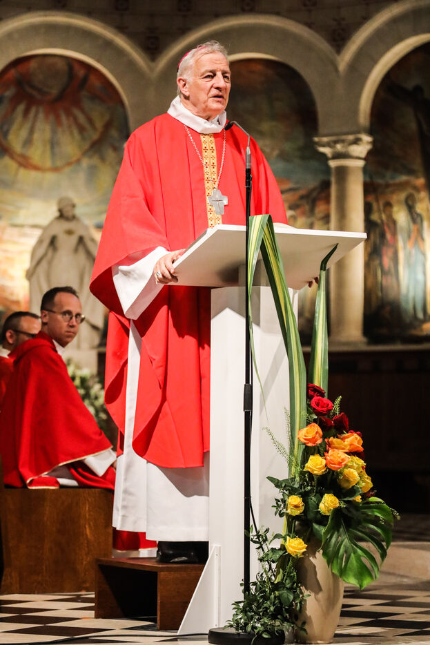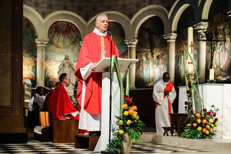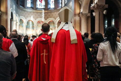 Monsignor Philippe Marsset, auxiliary bishop of the archdiocese, in the Church of Notre-Dame-de-la-Gare in Paris 75013, at the confirmation Mass for 19 young people from the NDG chaplaincy and the Madagascan chaplaincy on 28 May 2023.