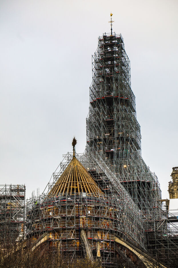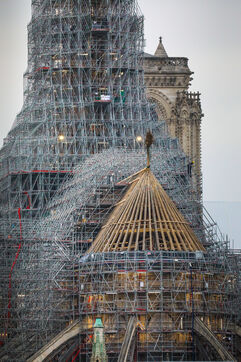 Travaux de reconstruction de la cathédrale Notre-Dame de Paris, suite à l'incendie du 15 avril 2019. Travaux de la flèche et de la charpente en bois.