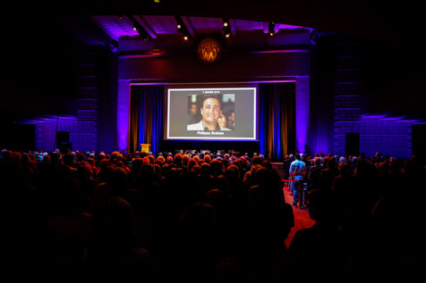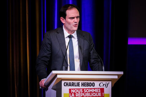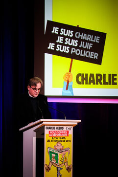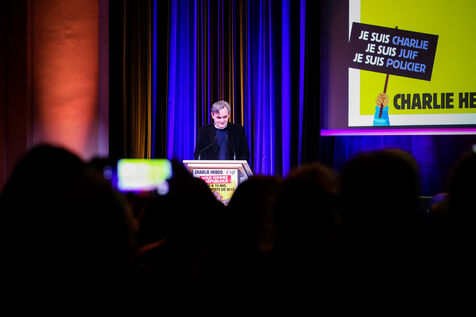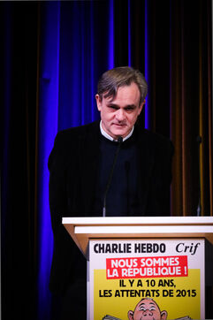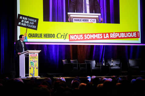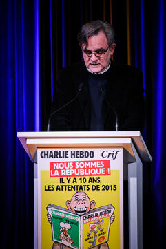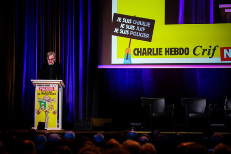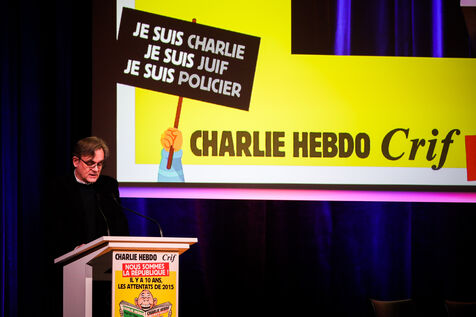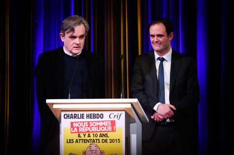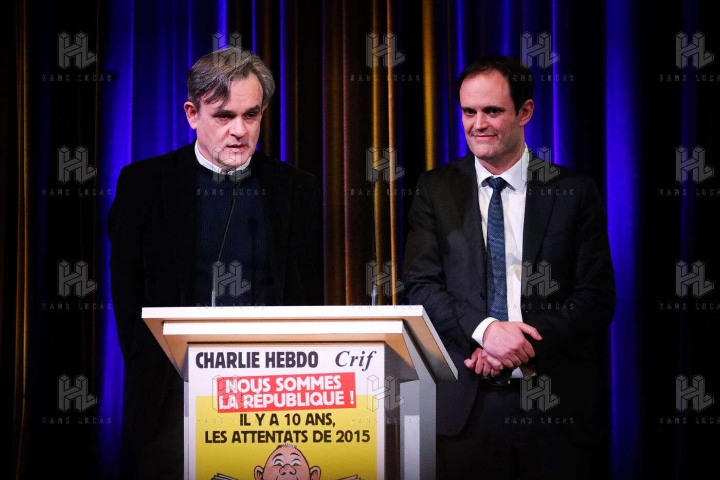 Evening of debates and tribute to the victims of the Hyper Cacher attack (Francois-Michel Saada, Yoav Hattab, Yohan Cohen, Philippe Braham) and Charlie Hebdo in January 2015 organized by Charlie Hebdo and the Crif at the Maison de la Mutualité in Paris, France on January 9, 2025.