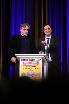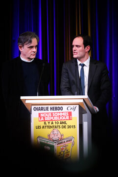 Soirée de débats et d'hommage aux victimes de l'attentat de l'Hyper Cacher (Francois-Michel Saada, Yoav Hattab, Yohan Cohen, Philippe Braham) et de Charlie Hebdo en janvier 2015 organisée par Charlie Hebdo et le Crif à la Maison de la Mutualité à Paris en France le 9 janvier 2025.