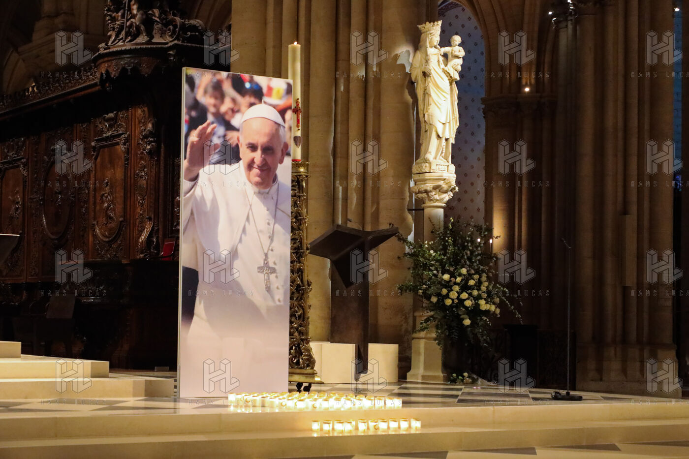 On the occasion of Pope Francis’s passing, Notre-Dame Cathedral in Paris paid tribute to the pontiff with several ceremonies: the bells rang 88 times at 11 a.m., followed by two Masses at 12 p.m. and 6 p.m., a rosary at 7 p.m., and a prayer vigil from 8 p.m. to midnight. The faithful gathered to pray for the repose of his soul in an atmosphere of deep emotion.