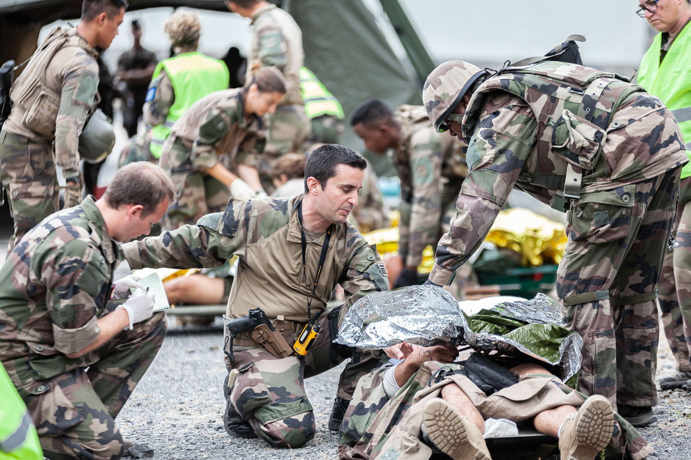 Entrainement sur la prise en charge médicale des blessés lors d'une opération extérieure de l' Armée Française. Lors de ces entrainements est présent le Corps Médical de L' Armée Française ainsi que les compagnies de combat prêtes aux projections sur les théatres de guerre.