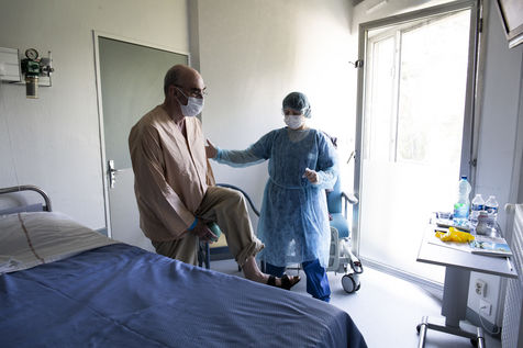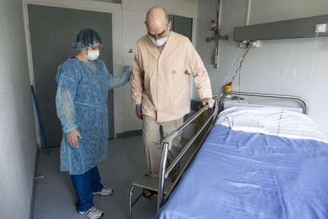 Physiotherapy exercises in the Aftercare and Rehabilitation (A.R.R.C.) department that help patients get back in shape for an early return home. After the weakening due to COVID-19, patients require special care in order to regain autonomy. Despite the respiratory genes still present, progress is very rapid. Medical supervision is always present to rule out any complications or recurrence of an acute phase.